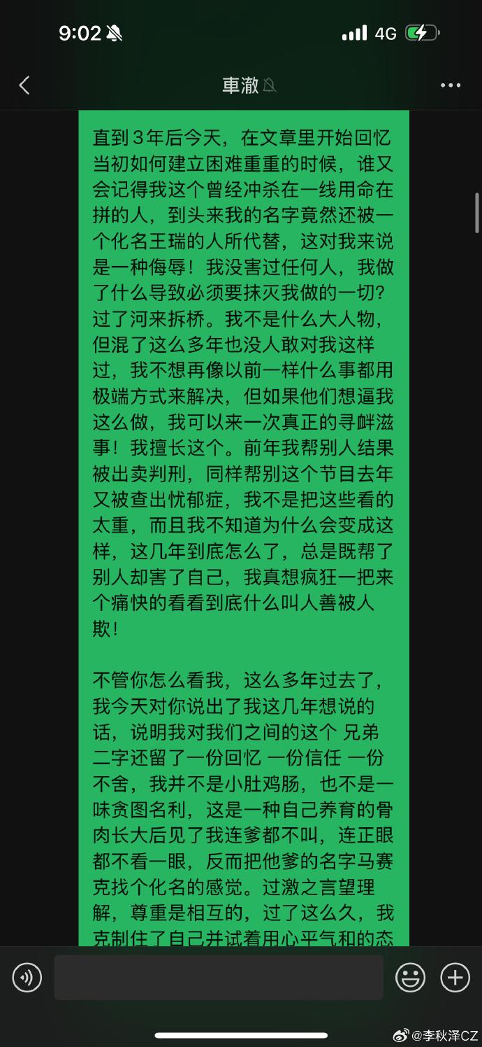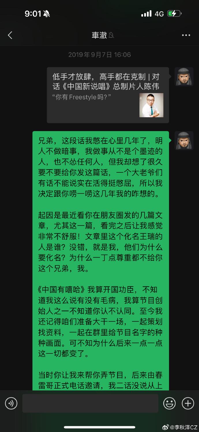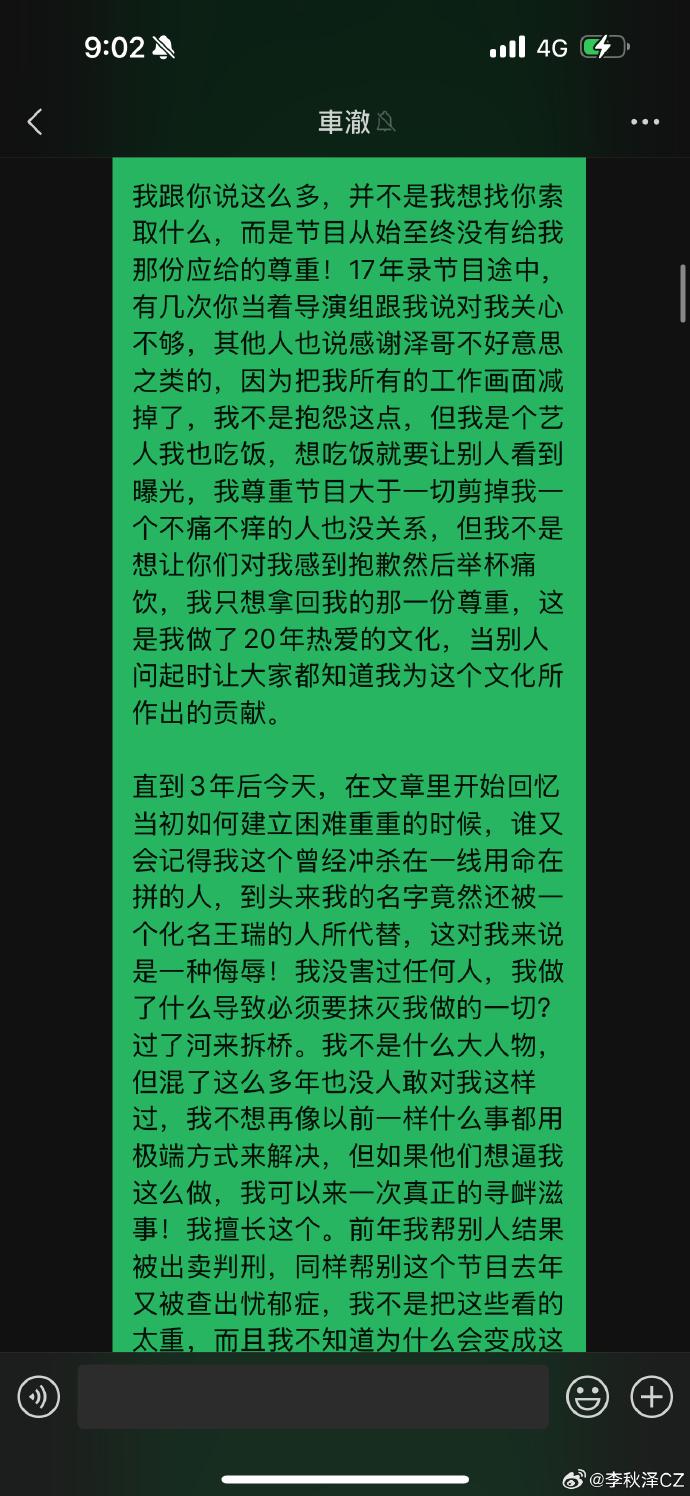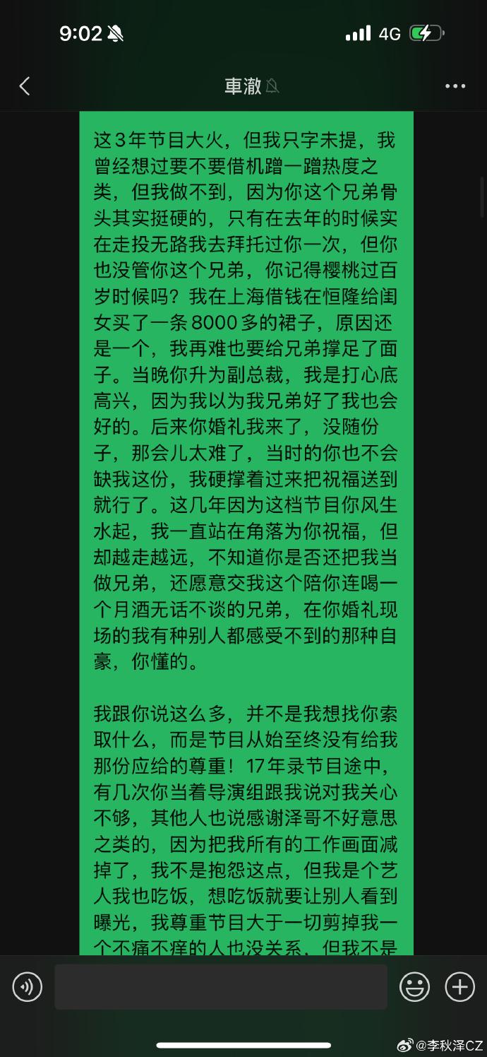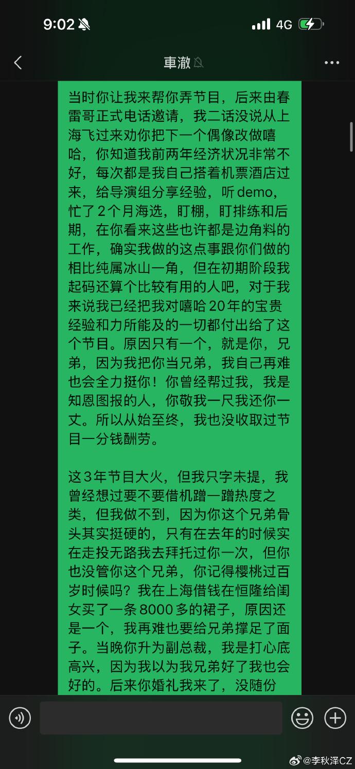 之后,李秋泽直接发了长文质问车澈,展示了当时的聊天记录。