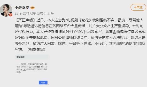 9月20日,《繁花》编剧秦雯发声明回应。她称注意到“《繁花》编剧署名不实、霸凌、辱骂他人是狗”等造谣诽谤信息在各网络平台大量传播,对广大公众产生严重误导。已委请律师对相关侵权信息发布者完成证据保全并提起诉讼。