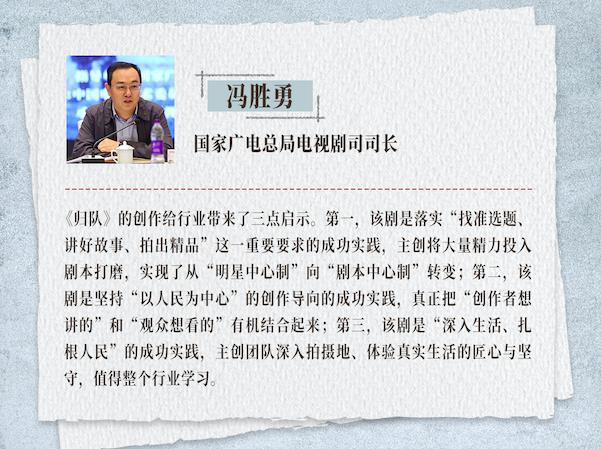 国家广电总局电视剧司司长冯胜勇指出,《归队》的创作给行业带来了三点启示。