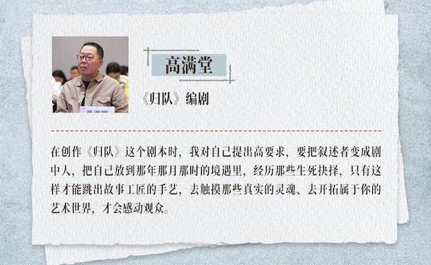 《归队》编剧高满堂谈到,在创作《归队》这个剧本时,他对自己提出高要求,要把叙述者变成剧中人,把自己放到那年那月那时的境遇里,经历那些生死抉择,只有这样才能跳出故事工匠的手艺,去触摸那些真实的灵魂、去开拓属于自己的艺术世界,才会感动观众。