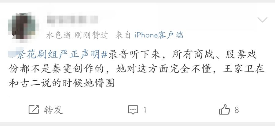此外,还有两段讨论剧本的会议录音曝光,长文和录音中提及《繁花》金融线、火烧丝光棉T恤衫生意线、Lily复仇线及汪小姐创业线的部分均有“古二”参与。