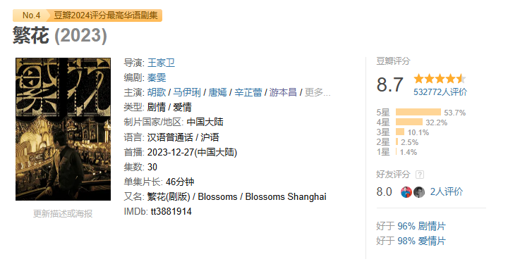 《繁花》于2023年12月播出,截至目前,该剧在豆瓣获得8.7分的高分(超53万用户打分),并荣获第29届白玉兰奖最佳编剧奖(改编)、第32届中国电视金鹰奖最佳编剧奖,以及第34届飞天奖优秀编剧提名。