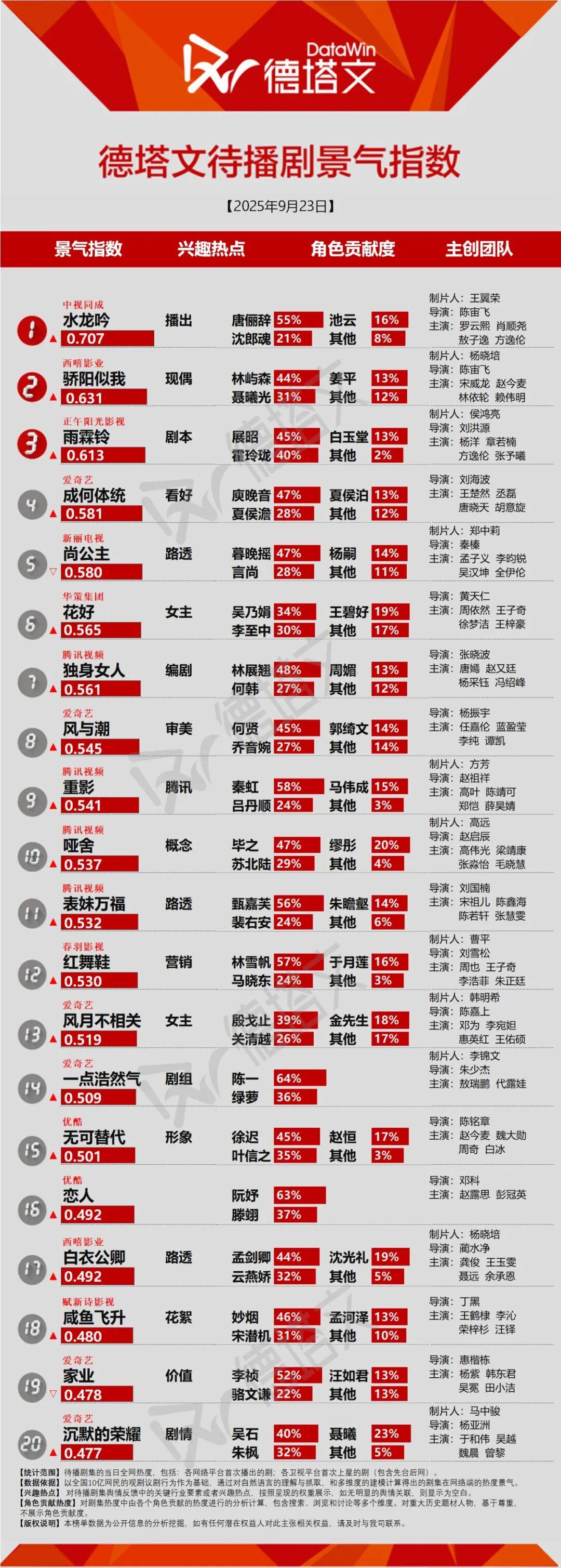 水龙吟(唐俪辞55% 沈郎魂21%) 骄阳似我(林屿森44% 聂曦光31%) 雨霖铃(展昭45% 霍玲珑40%) 成何体统 尚公主 花好 独身女人 风与潮 重影 哑舍 表妹万福 红舞鞋 风月不相关 一点浩然气 无可替代 恋人 白衣公卿 咸鱼飞升 家业 沉默的荣耀