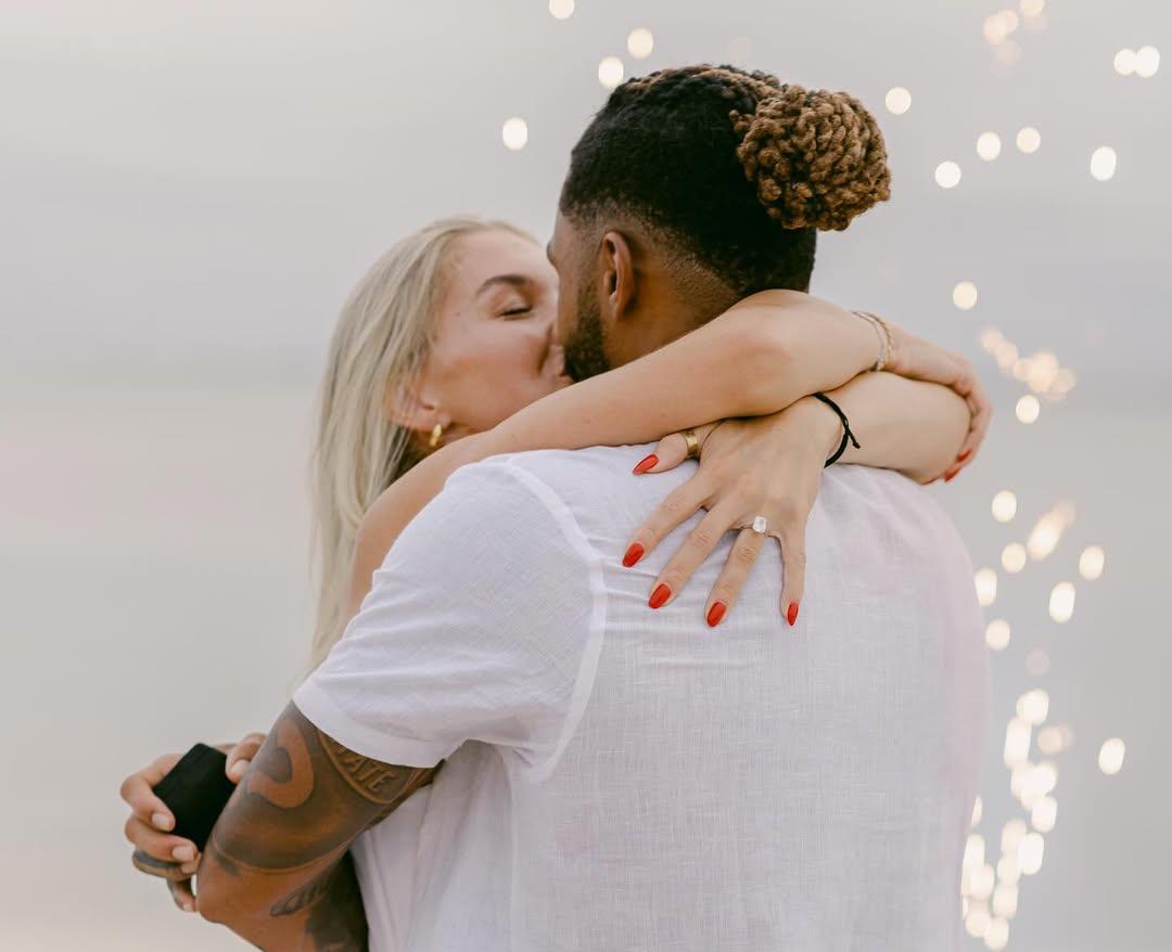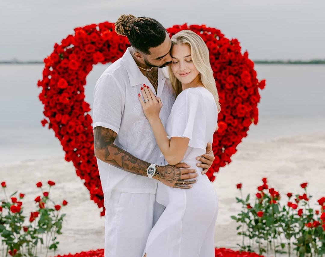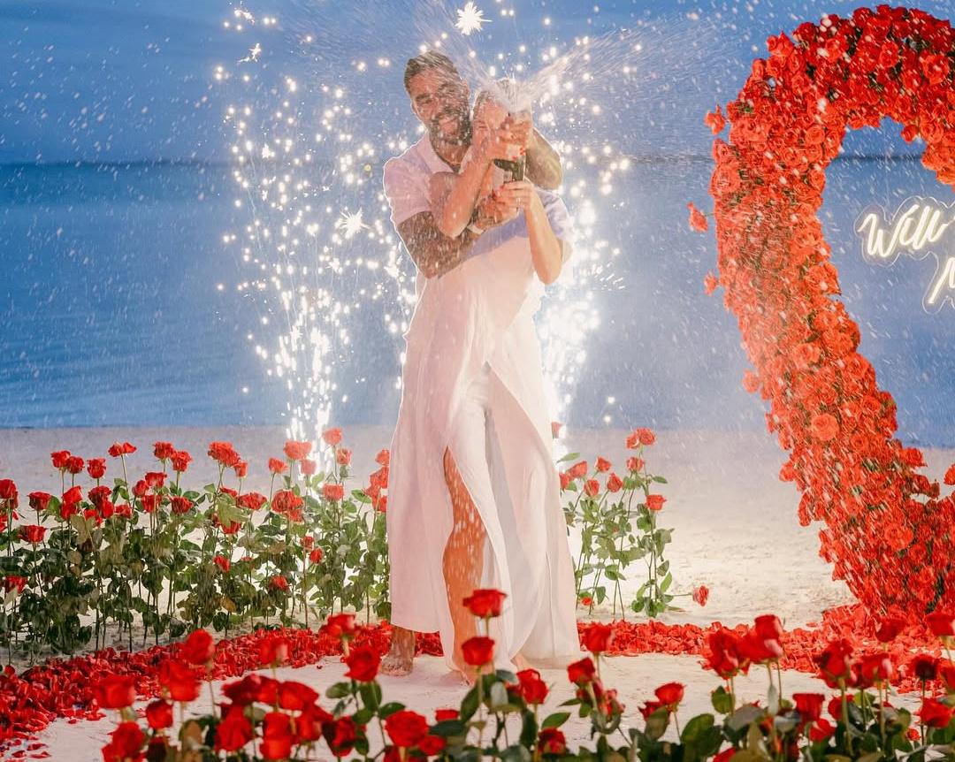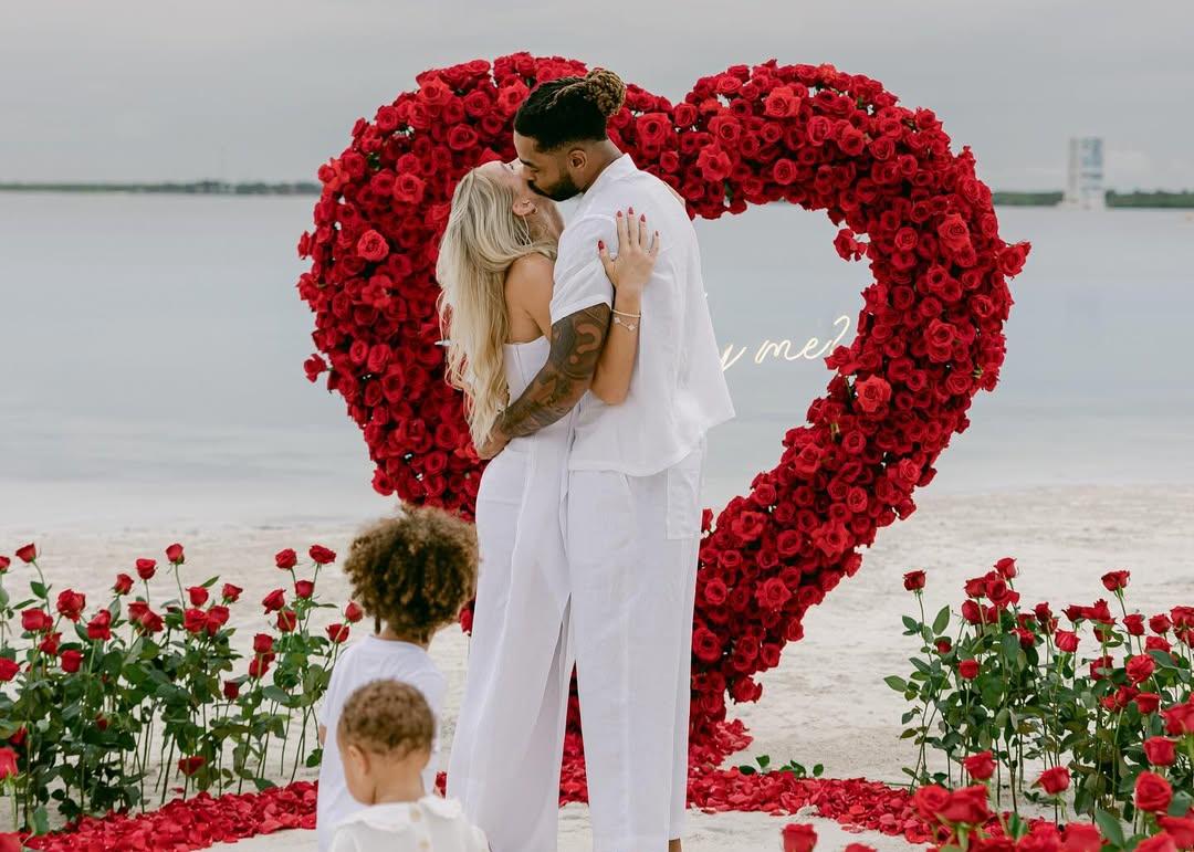 求婚地点在一处海边的沙滩上,地上用玫瑰花瓣围了一个心形,边上还插满玫瑰花朵,朝向大海的一侧,还用玫瑰花做了一个心形拱门。拉塞尔和劳拉都穿了白色的衣服,光着脚丫站在沙滩上。拉塞尔掏出钻戒向劳拉求婚成功。两人随后浪漫拥吻在一起。海滩上燃放了烟花,庆祝拉塞尔求婚成功。拉塞尔和劳拉的两个孩子也在现场,一个是儿子,另一个是女儿。29岁的拉塞尔儿女双全,成为他未婚妻的劳拉是一位小有名气的时尚模特,颜值很高,身材傲人。拉塞尔不愧是人生赢家。