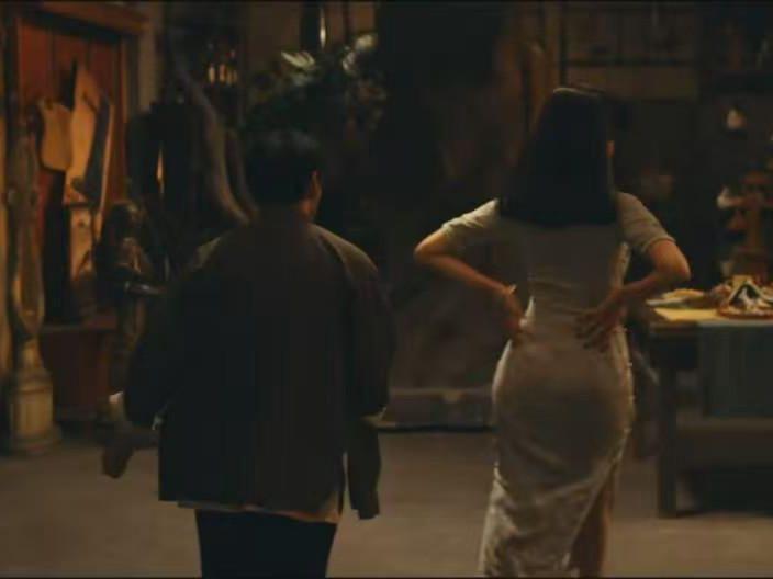 冼碧云一出场,是她来到剧院后台找东西,通过躲藏在柜子里的丁一和顾仰山的视线,镜头展现了张天爱穿着旗袍的婀娜身姿。