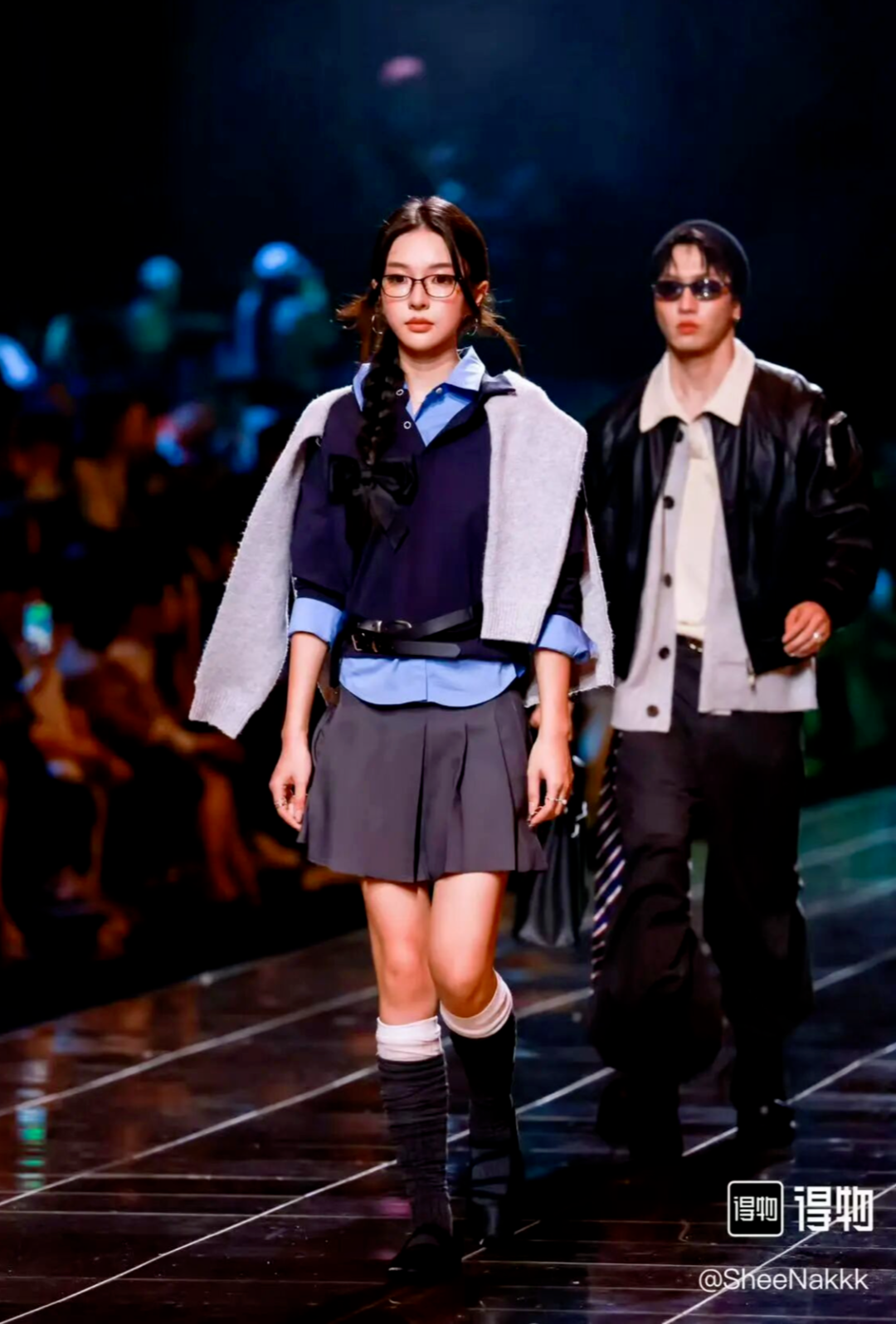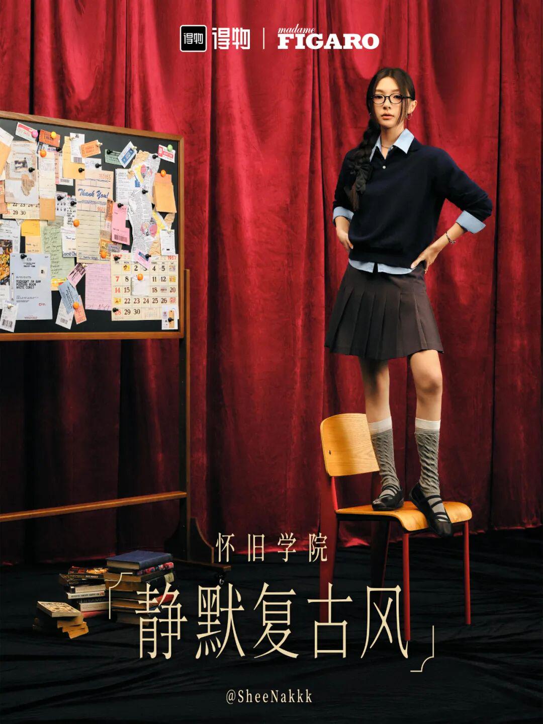@SheeNakkk 的演绎则更显轻盈少女感。她分享的穿搭公式清晰体现了静默复古风的适配性:5分基础款(蓝衬衣+灰百褶裙)、3分复古单品(叠穿袜+芭蕾运动鞋)、2分小心机(圆框眼镜),完美平衡了复古与时尚、优雅与活力。