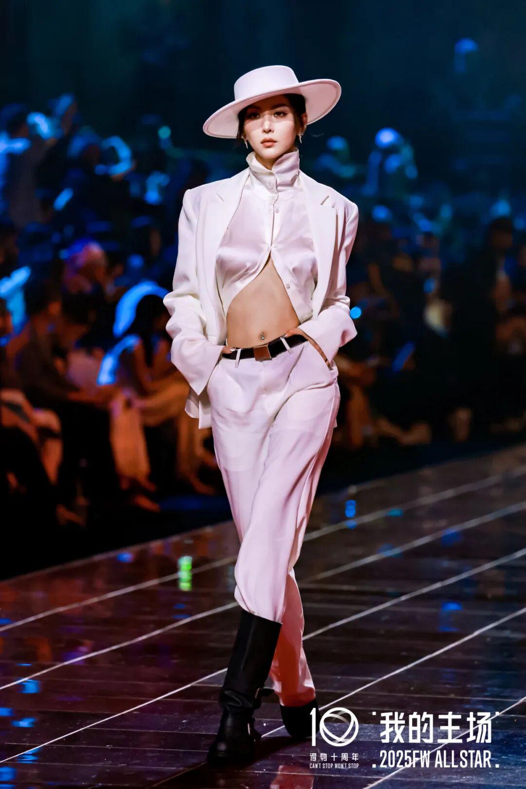 腻腻ninii则演绎出静默复古的霸气与柔美。性感衬衫与白西装的刚柔对比,在风格白圆帽的加持下,交织出复古与摩登并存的浪漫叙事。