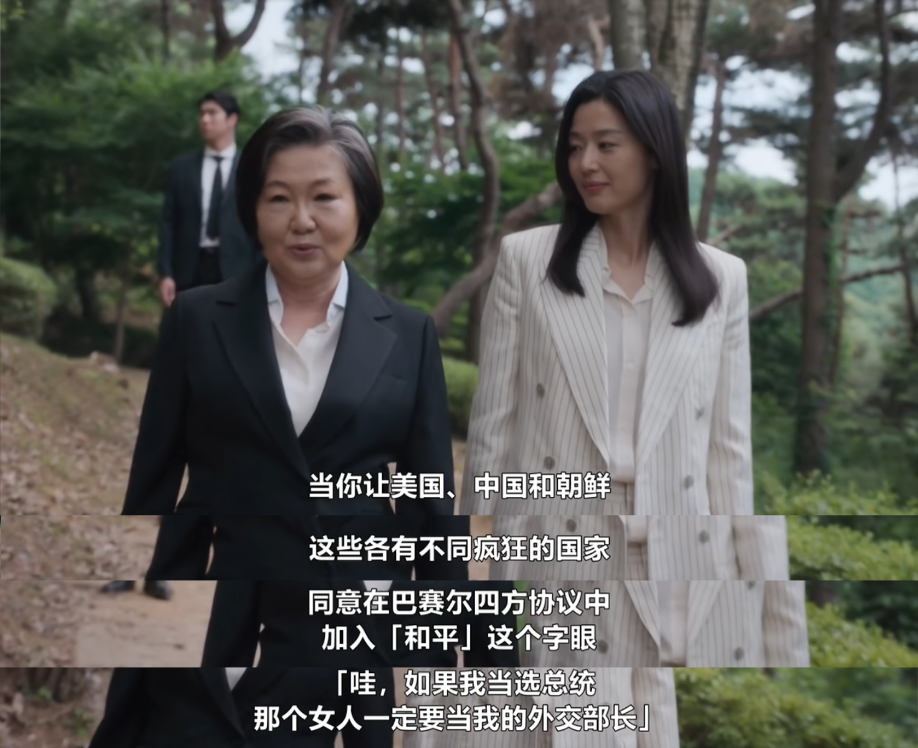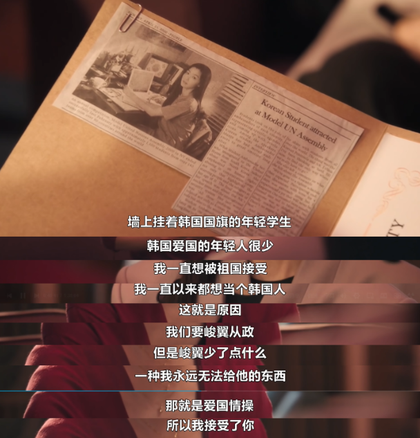 并且,这个设定还得到了女主婆婆的口头认证,说我之所以接受你一个无权无势的小姑娘当我儿媳妇,就是因为你比我儿子,这个土生土长的韩国人,还要热爱韩国,这有助于我儿子参加韩国总统的竞选。