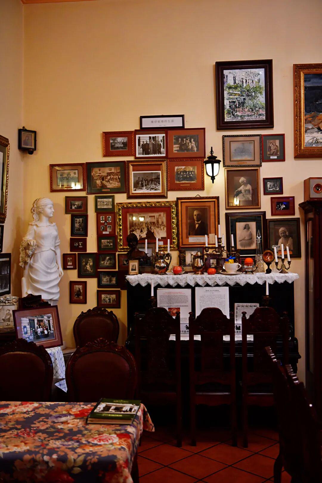 走进餐厅,浓厚的历史感扑面而来。正中墙壁悬挂着俄国画家1906年创作的、店主人曾外祖母的油画像;四周墙壁挂满哈尔滨早期开埠的原版历史老照片;店内展示的1889年法国名琴,曾被店主人母亲好友妮娜的妹妹弹奏过。这些陈设复原了当年俄式餐厅的风貌,也让这里成了影视创作的绝佳背景。