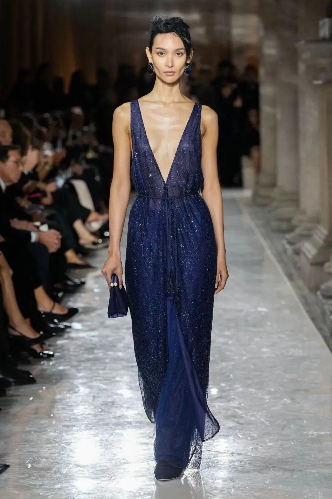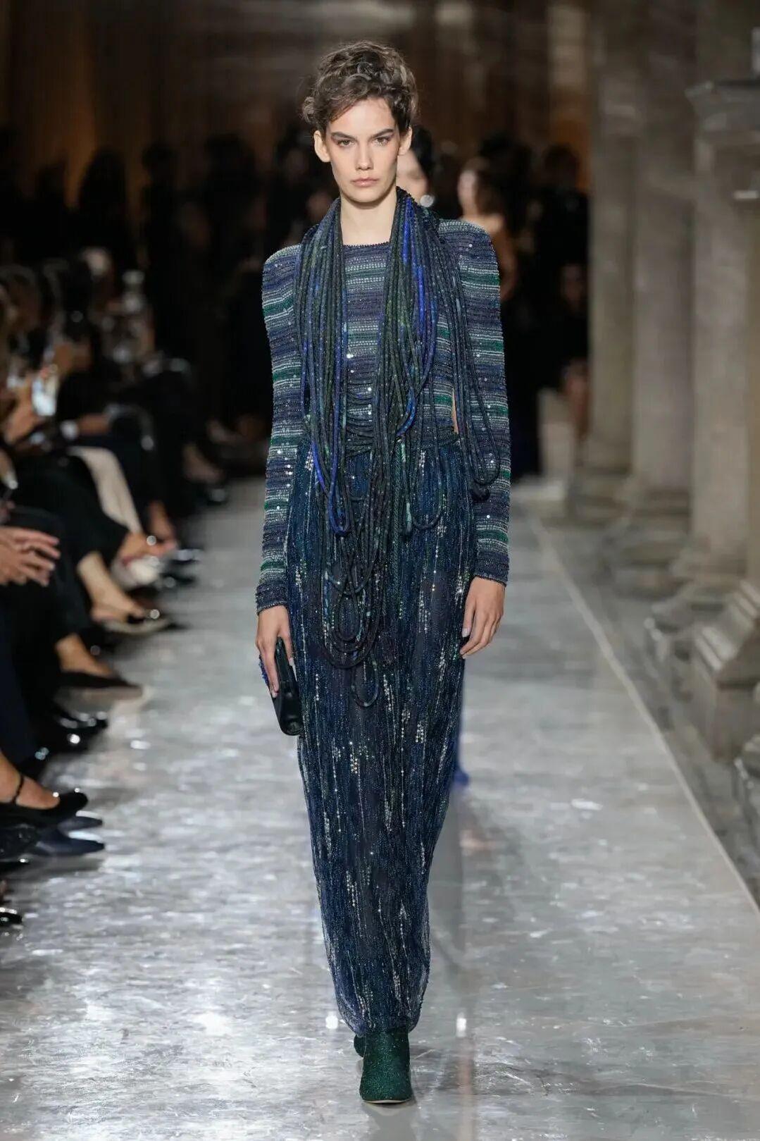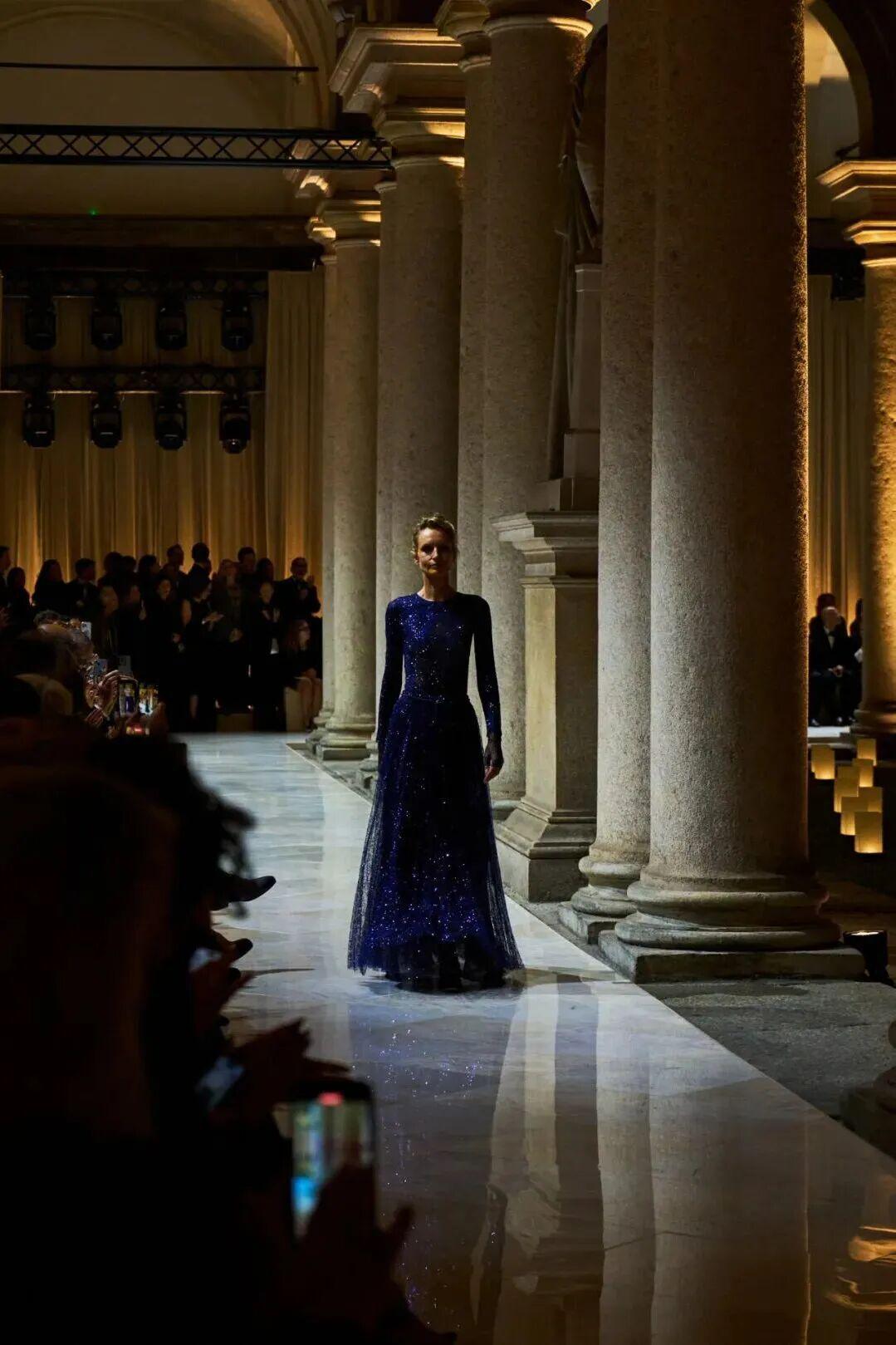 不论是高定还是成衣,你都能看到Giorgio Armani老爷子满满的诚意。这一季的时装依旧是一场探索自然的旅程,从色彩上我们就能察觉。依然是他钟爱的蓝灰色调——灵感取自潘泰莱里亚岛,海洋与火山的对话、光与大地的交织,从自然中性色到深邃夜蓝,再到流光溢彩的珍稀色调,仿佛描摹出他一生对自然与自由的深情。