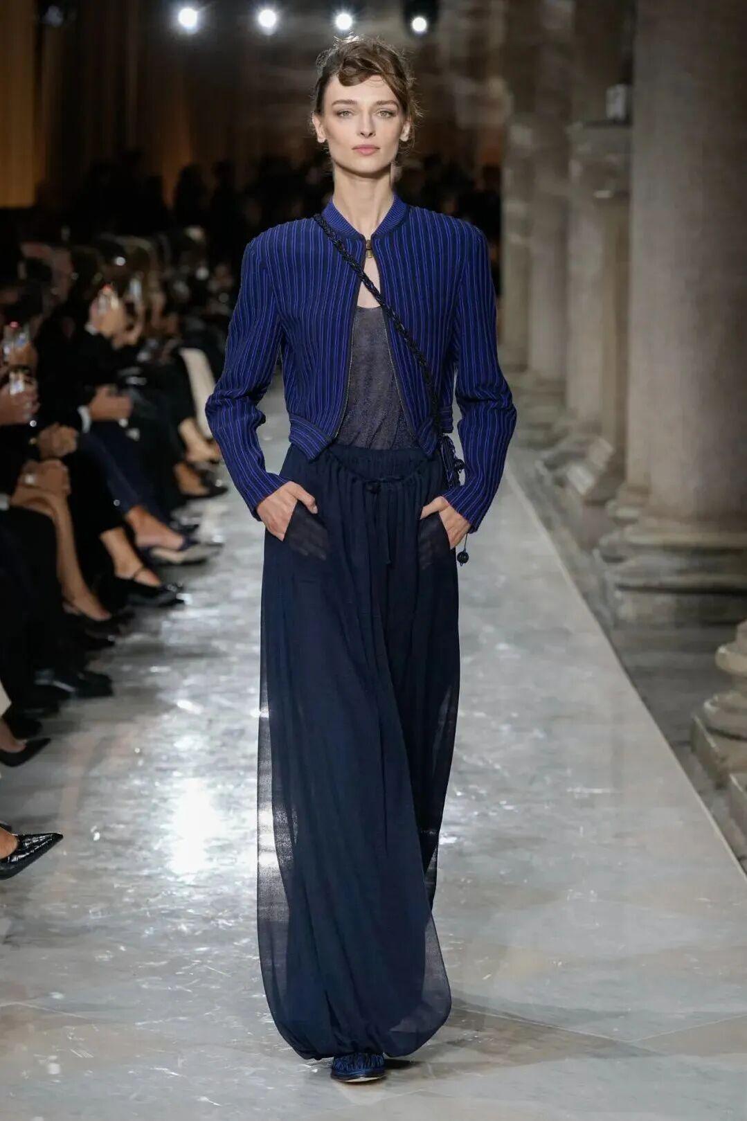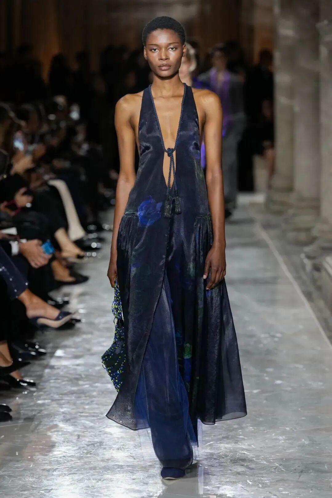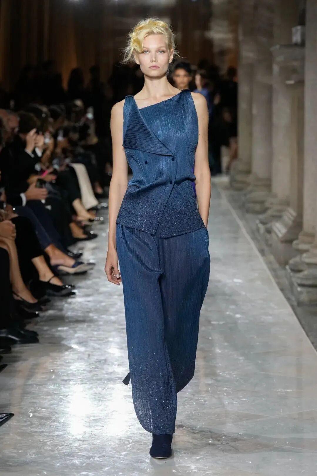 不论是高定还是成衣,你都能看到Giorgio Armani老爷子满满的诚意。这一季的时装依旧是一场探索自然的旅程,从色彩上我们就能察觉。依然是他钟爱的蓝灰色调——灵感取自潘泰莱里亚岛,海洋与火山的对话、光与大地的交织,从自然中性色到深邃夜蓝,再到流光溢彩的珍稀色调,仿佛描摹出他一生对自然与自由的深情。