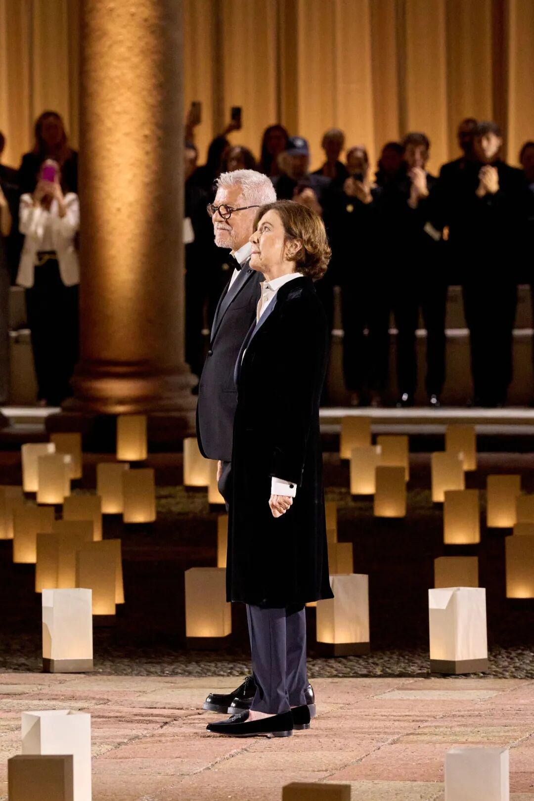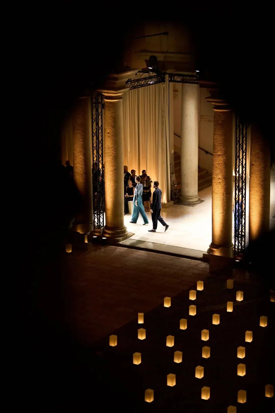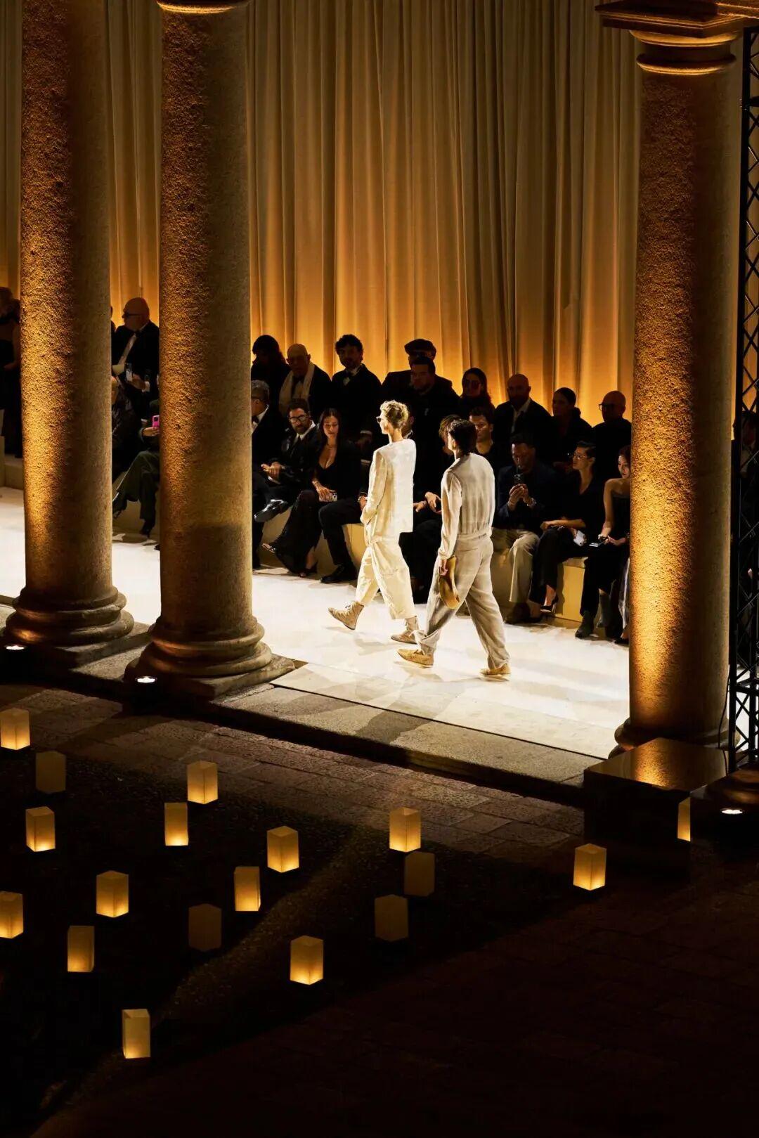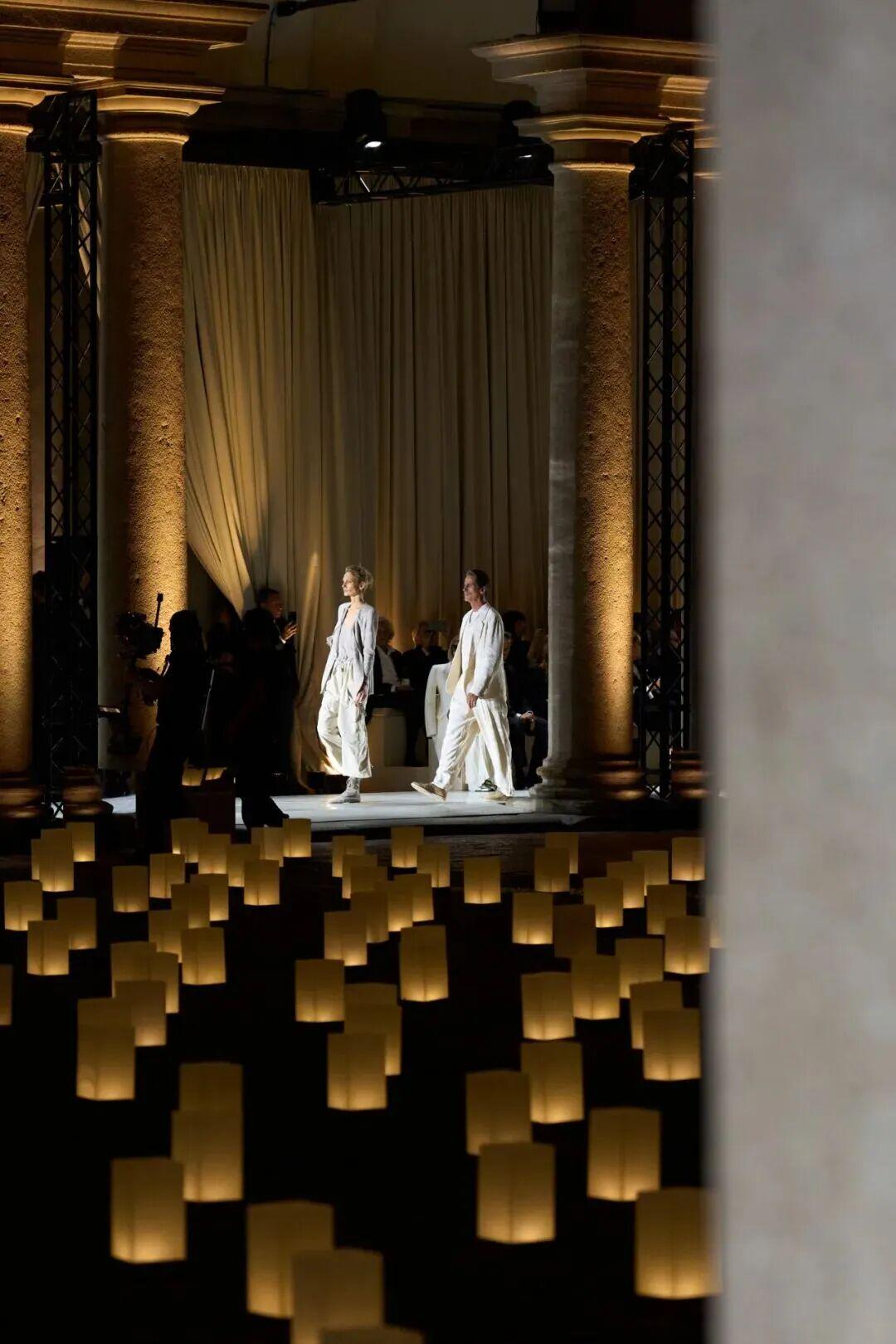 这场发布会选址于米兰布雷拉画廊, 历史的穹顶与艺术的光影交织, 回廊庭院间,数百盏灯笼般的灯具点亮夜空, 为这位老爷子的收官之作披上了诗意的光。