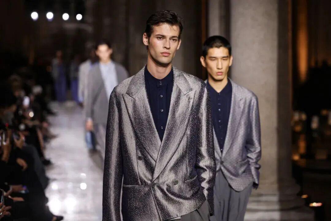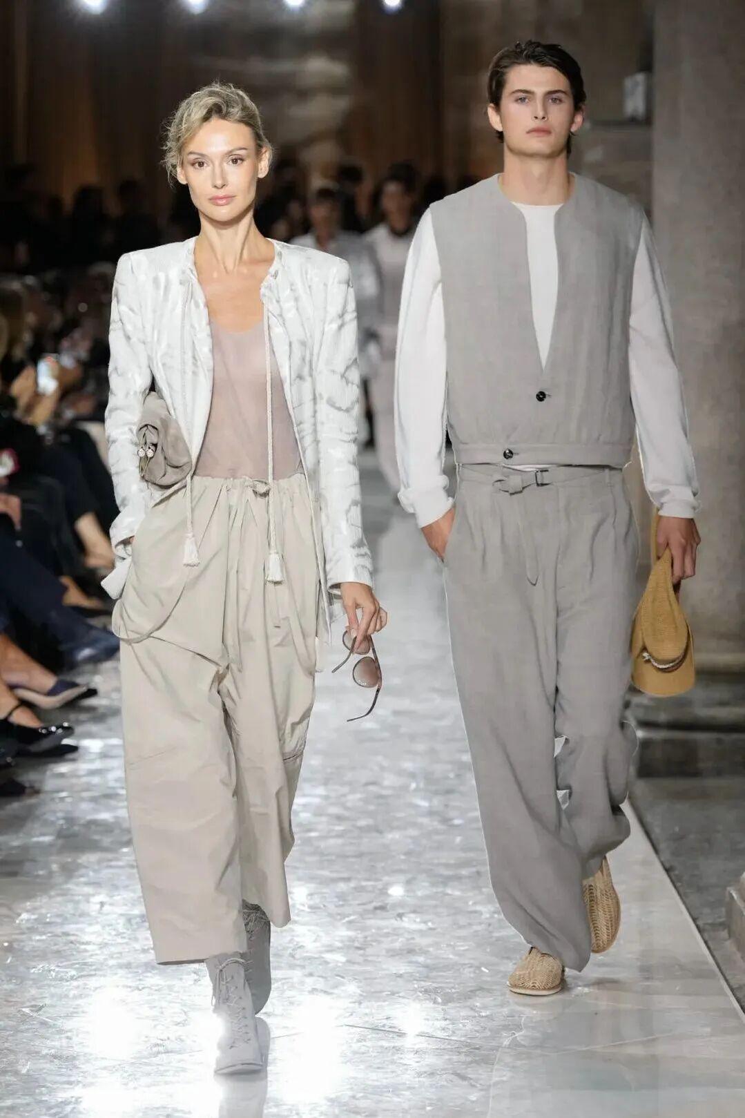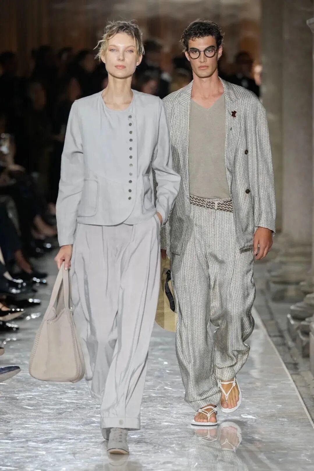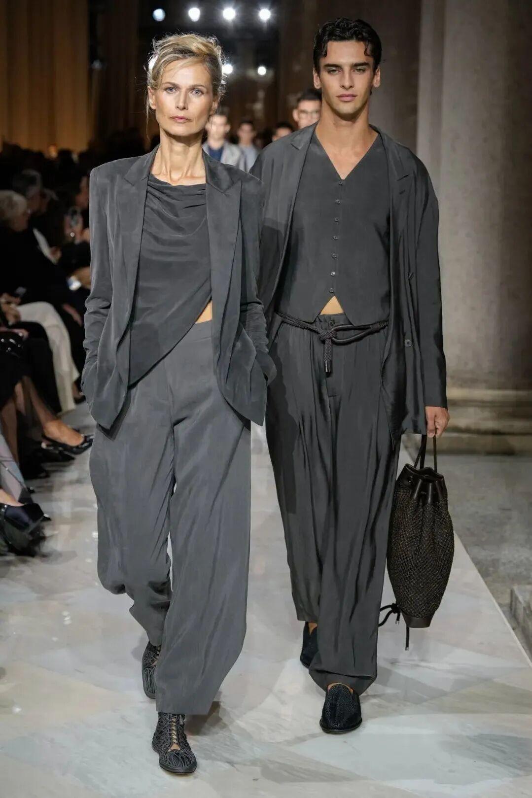 本系列似乎回溯那些贯穿五十年的经典符号。正如大秀开始的一系列灰色调无结构西装外套,“看似简约,却蕴含无限可能”:流畅的廓形、轻盈的面料、无性别的比例、海军蓝与米灰的调和、闪光中蕴含的深意。这是一种独属于Giorgio Armani的永恒优雅魅力,也展现了品牌的精湛工艺和对品质的追求。
