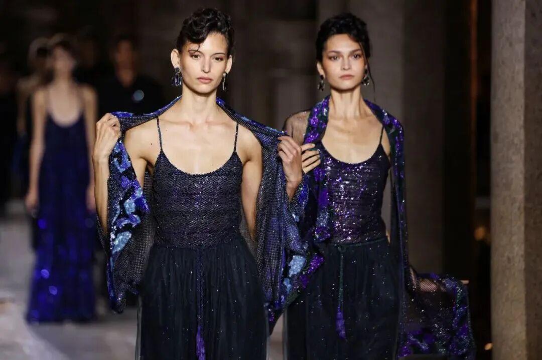 而光泽,依旧是Giorgio Armani的语言。天鹅绒与丝绸交错,提花与细闪流动, 晚装刺绣繁复却不失轻盈, 在光影之间,镌刻出他留给时尚界的不朽印记。