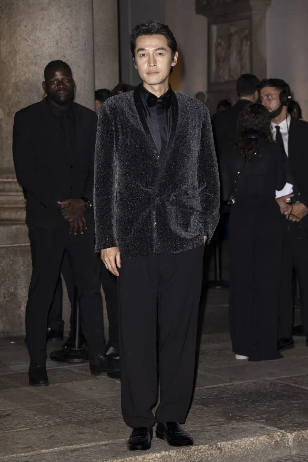 品牌全球形象代言人胡歌身穿Giorgio Armani 2025秋冬男装系列的黑丝绒外套,矜贵优雅。