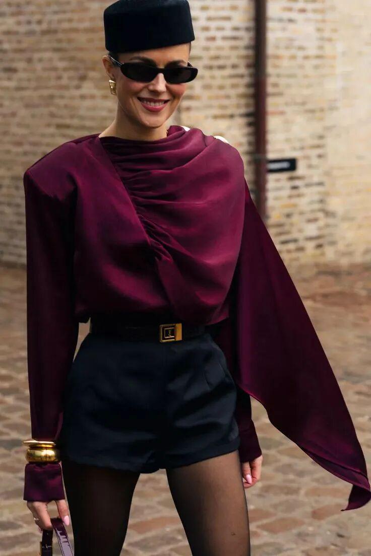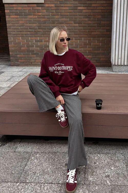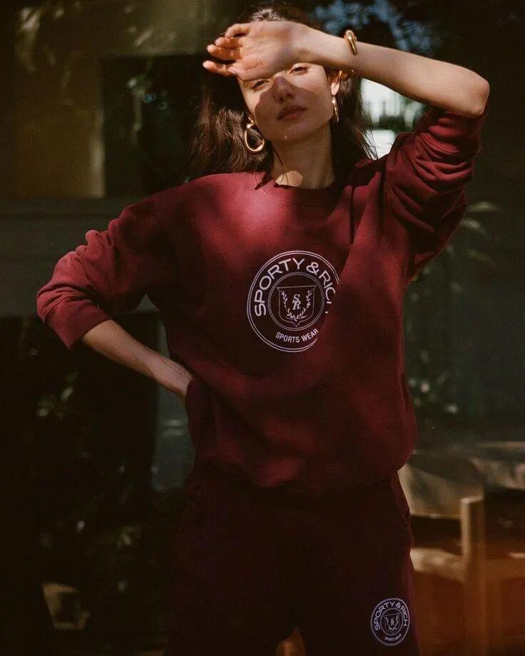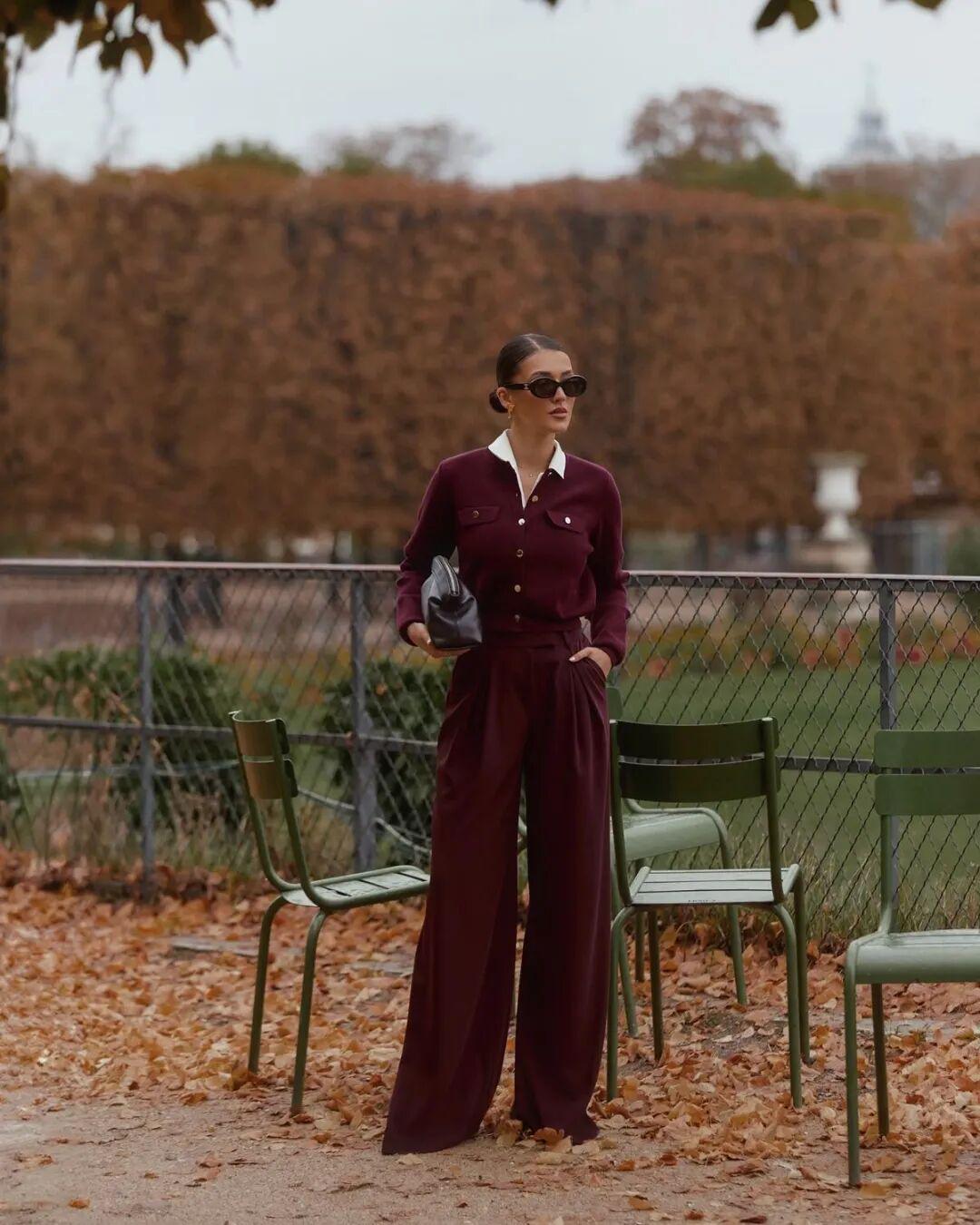 如果选择一整套复古运动套装,暗红的存在能让成套感不至于显得单调,反而因为色彩的厚重而带来视觉张力。