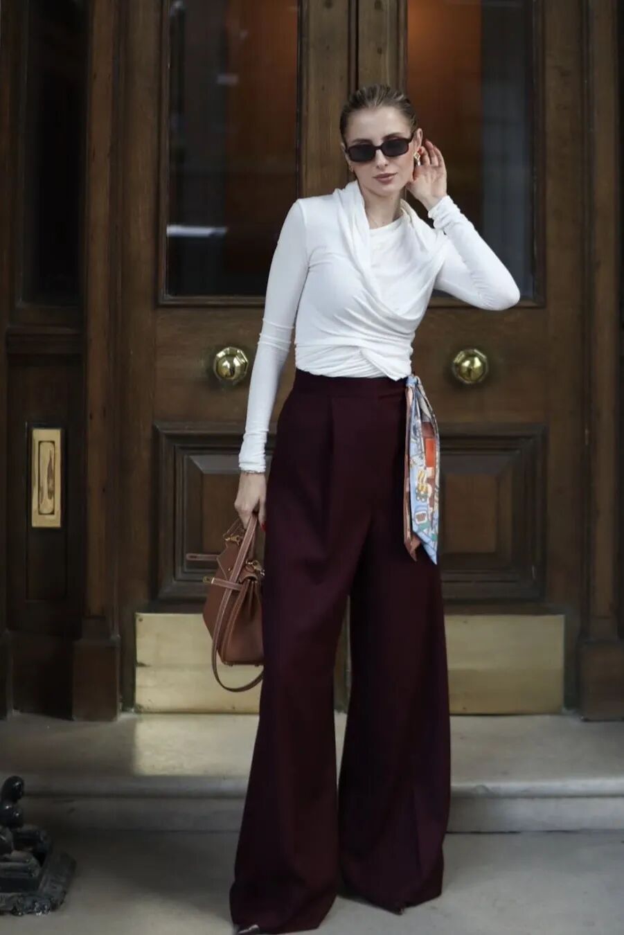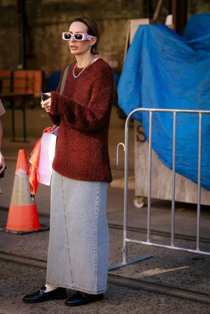 另外,复古红针织也适合与低饱和色呼应。奶油白、驼色、深灰都是理想选择,它们不会削弱暗红的浓烈,反而能让这种复古感更细腻。