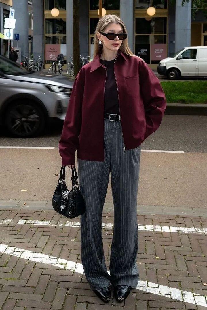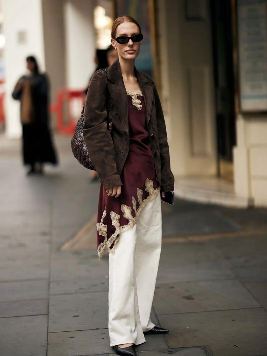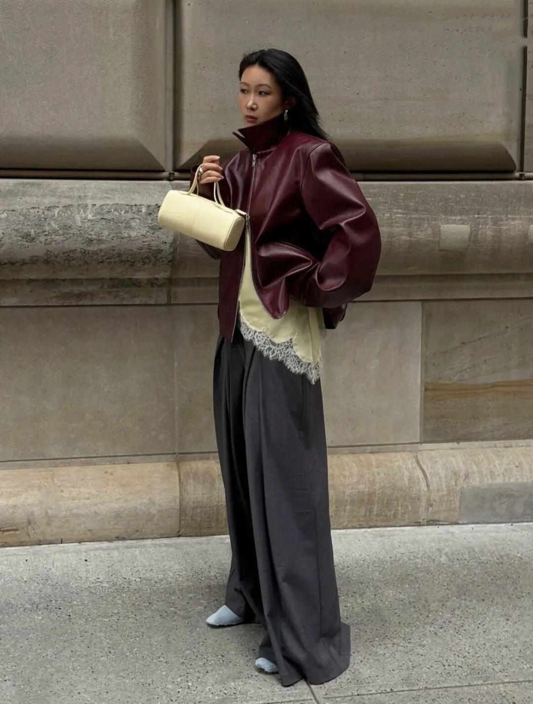 其他配搭单品的选择上,复古红夹克与简洁内搭最合拍。白色、米色都能托出色彩的深邃,而不会喧宾夺主。