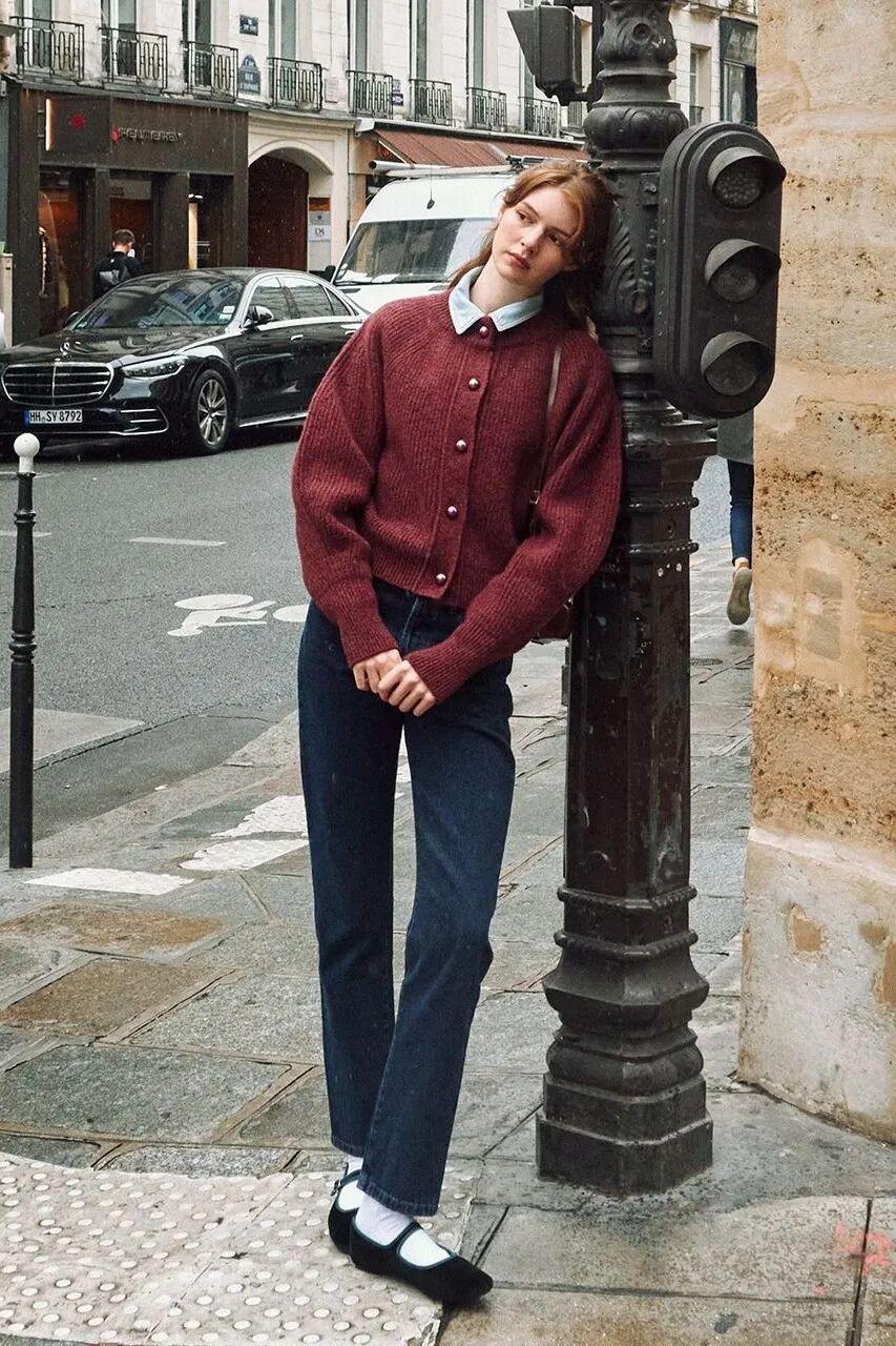 如果选择短款复古红针织开衫,可以与高腰裙或阔腿裤呼应,勾勒腰线的同时,让整体更显俏丽。