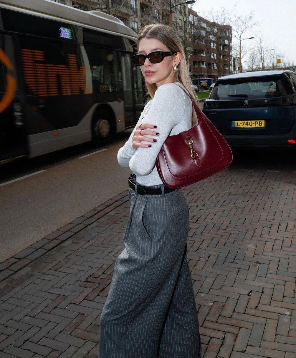 再如复古红手袋,搭配中性色不仅有色彩上的冲突美感,也像是在低调的外表下藏着一丝热烈。