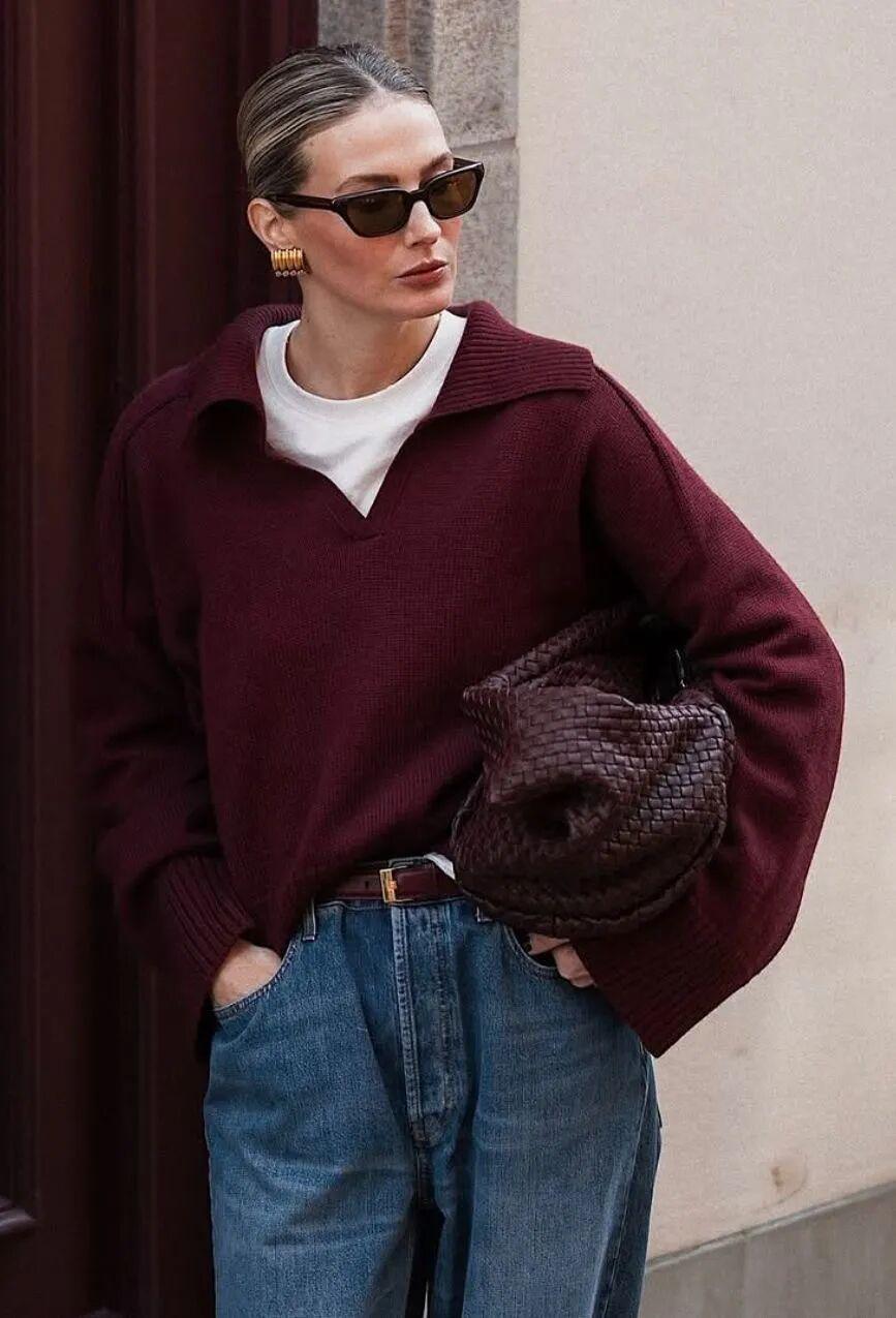 层叠穿搭,也是复古红针织衫的优势所在,比如复古红毛衣与蓝衬衫搭配,点缀一抹深蓝或墨绿,与复古红形成微妙的互补关系。