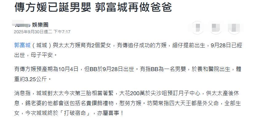 紧接着港媒又爆料称方媛三胎生了,60岁的郭富城三度当爸了。