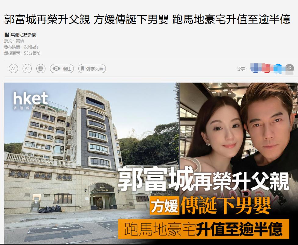 港媒还提到为了能够让妻子产后能够好好休息,郭富城豪掷200万港元在尖沙咀为方媛预定了贵族级月子中心。
