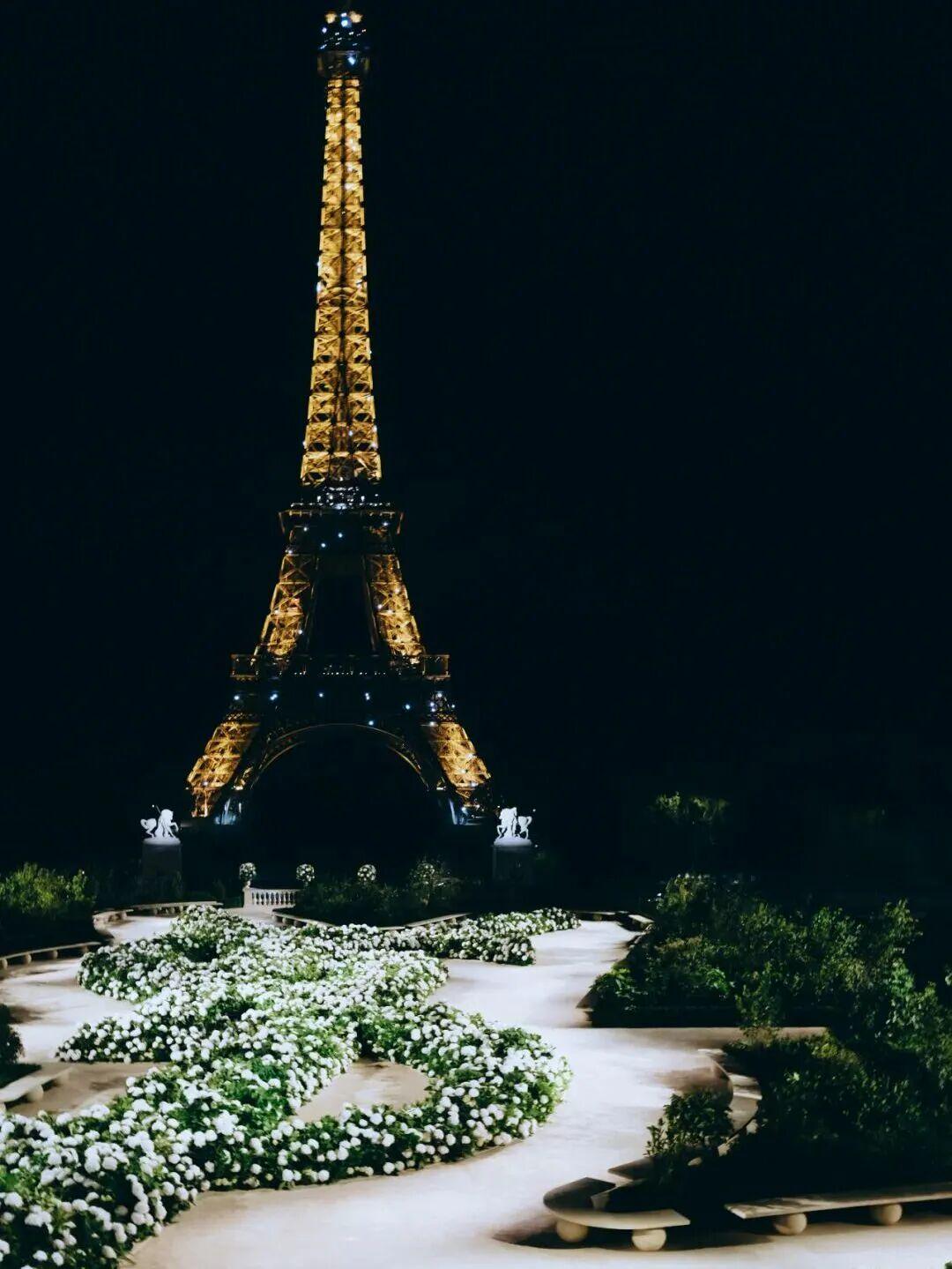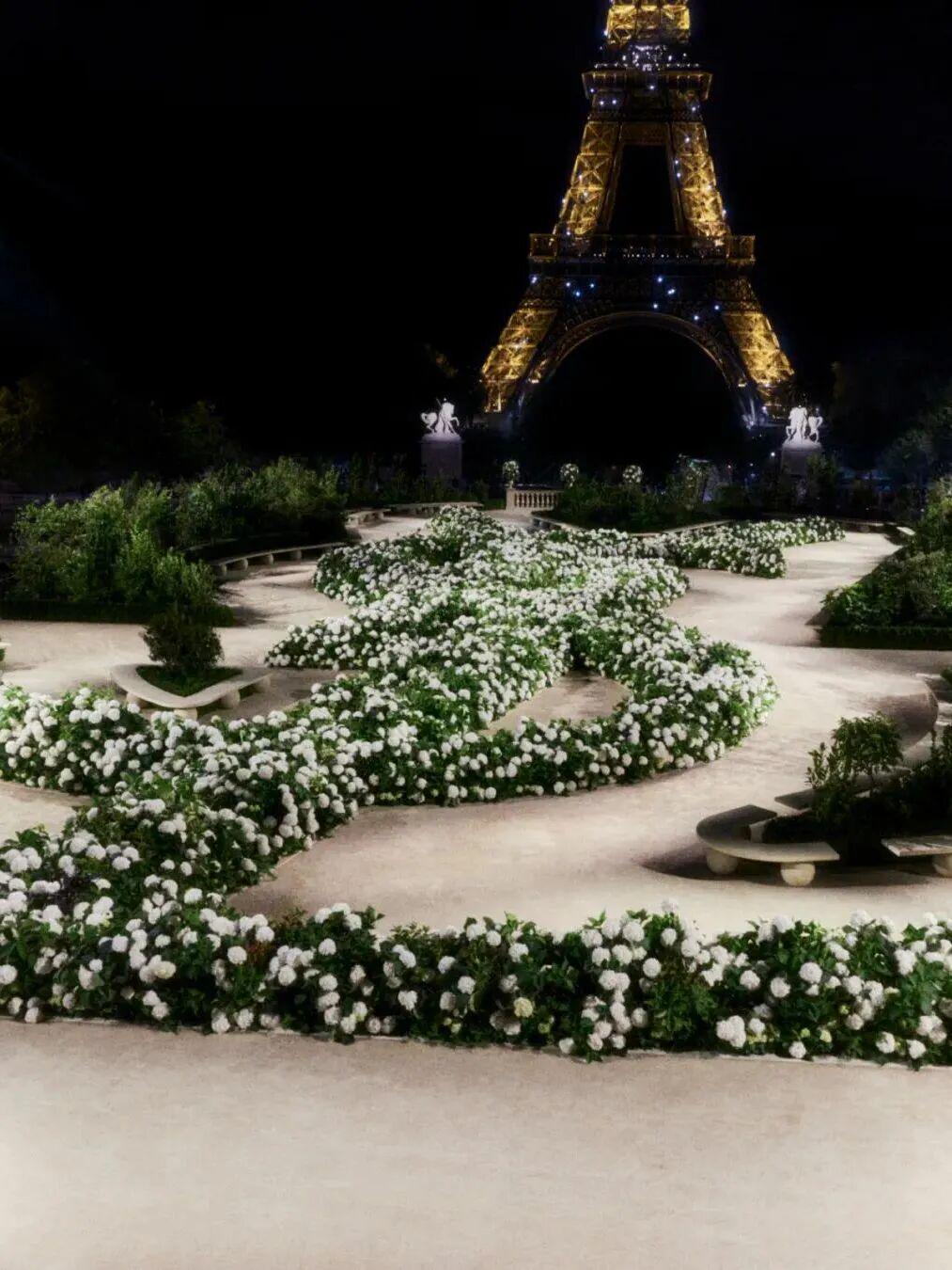 夜幕低垂,铁塔闪烁着标志性的光影,白色绣球花海拼接成巨型YSL Logo,观众环坐四方,共同见证一场关于时装与浪漫的盛宴。