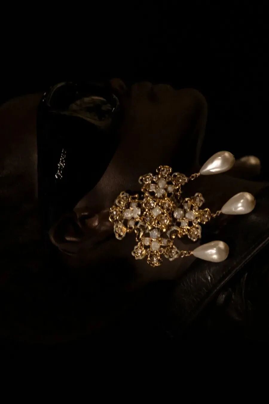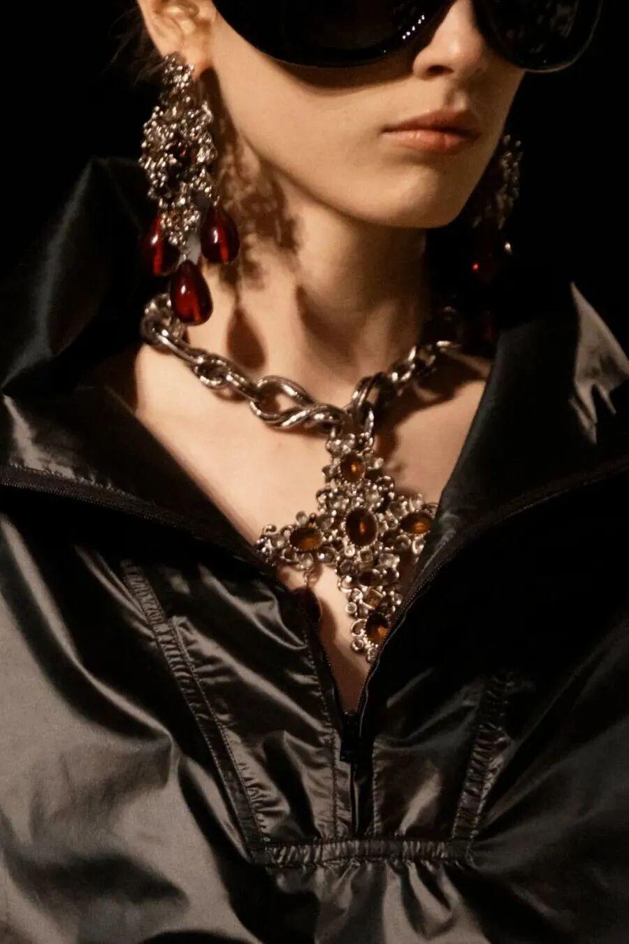 自Yves时代起,夸张配饰便是圣罗兰女郎的标志之一。本季,Anthony Vaccarello延续并放大这一视觉语言——色彩饱和、体积感强烈的拜占庭风首饰与雕塑感墨镜呼应,赋予造型浪漫与力量并存的戏剧张力。