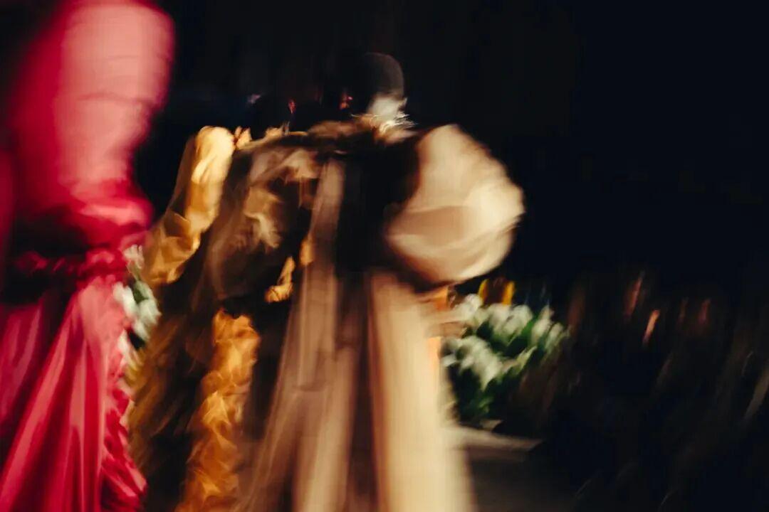 最后一幕,浪漫主义回潮。宽袖飘裙、前襟褶皱,宛若Yves时代的高级定制记忆。