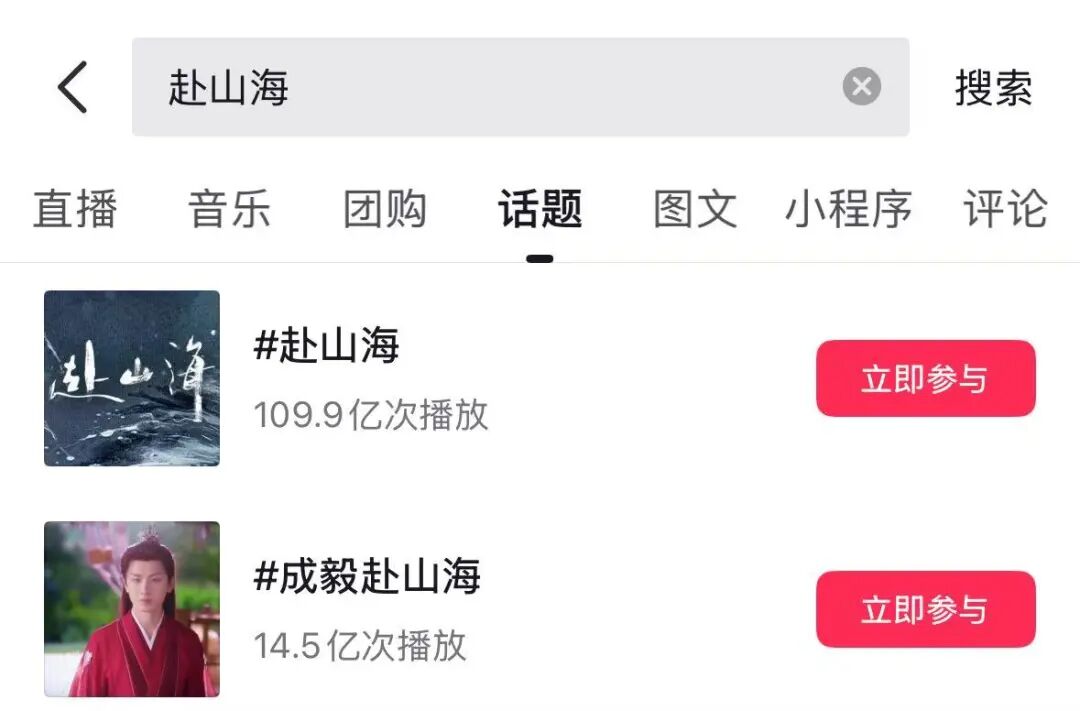 抖音的#赴山海# 话题,总播放量高达109亿。其中#赴山海大结局#、#赴山海打戏#、#赴山海开播#、#逐帧分析赴山海# 等话题多次登上抖音娱乐榜榜单TOP3。分话题中,#成毅赴山海# 播放量14.5亿、#赴山海穿书上强度# 播放量3.9亿、#赴山海越看越高能# 播放量3.2亿、#赴山海进入终局之战# 播放量3.2亿。