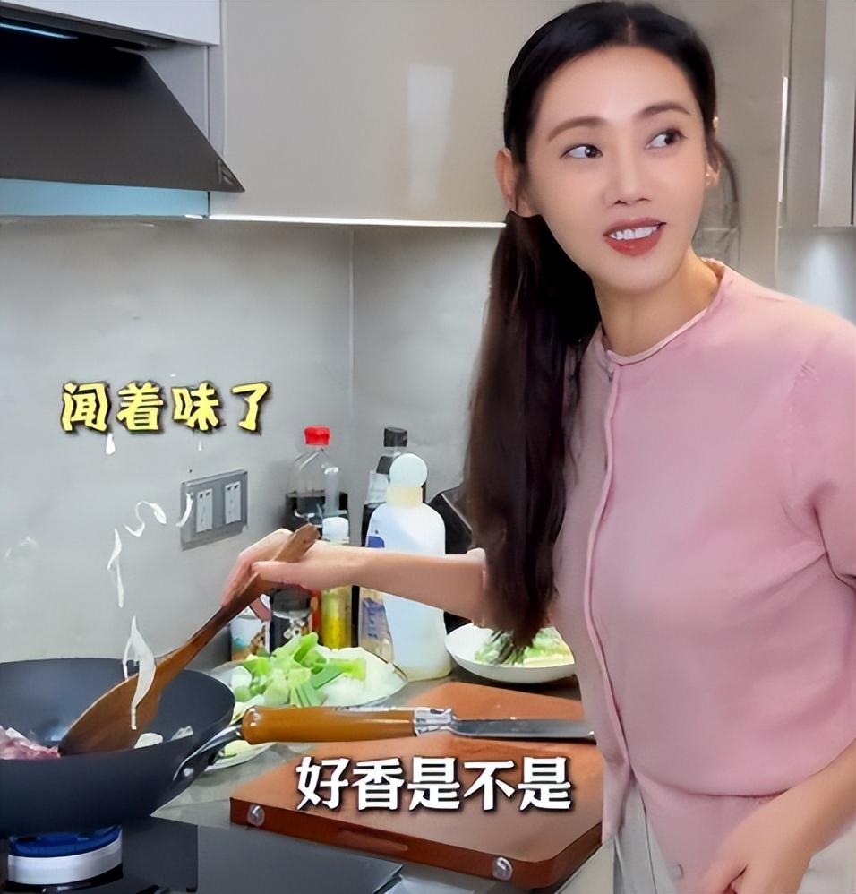 47. 视频中,她未施粉黛,身穿简单的家居服,在厨房里熟练地切菜炒菜。