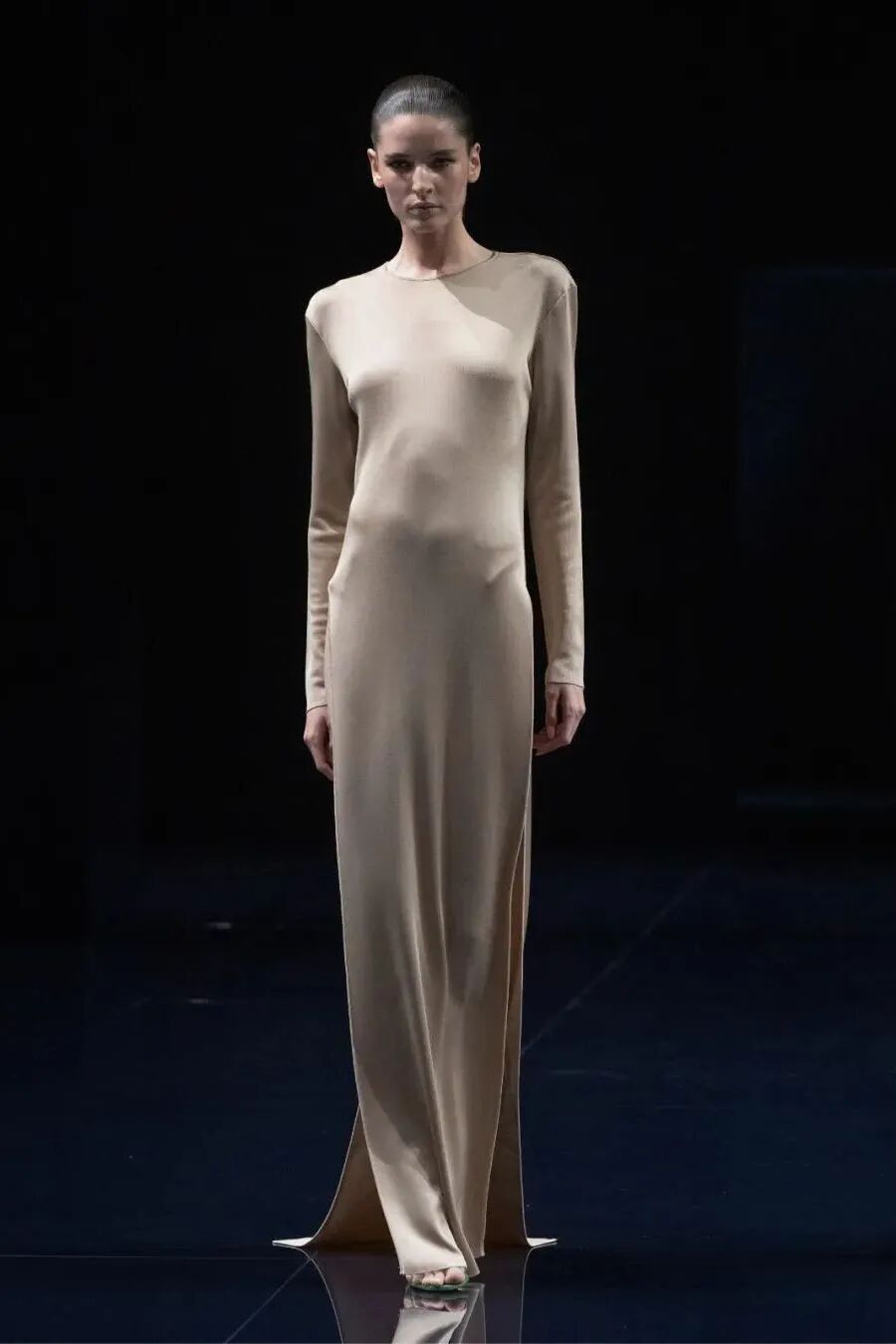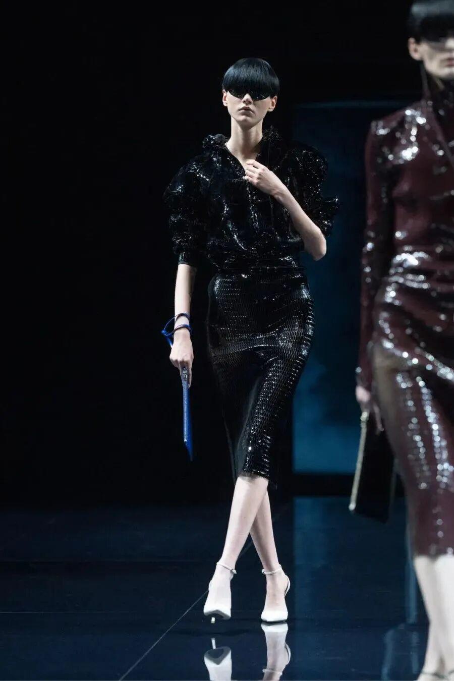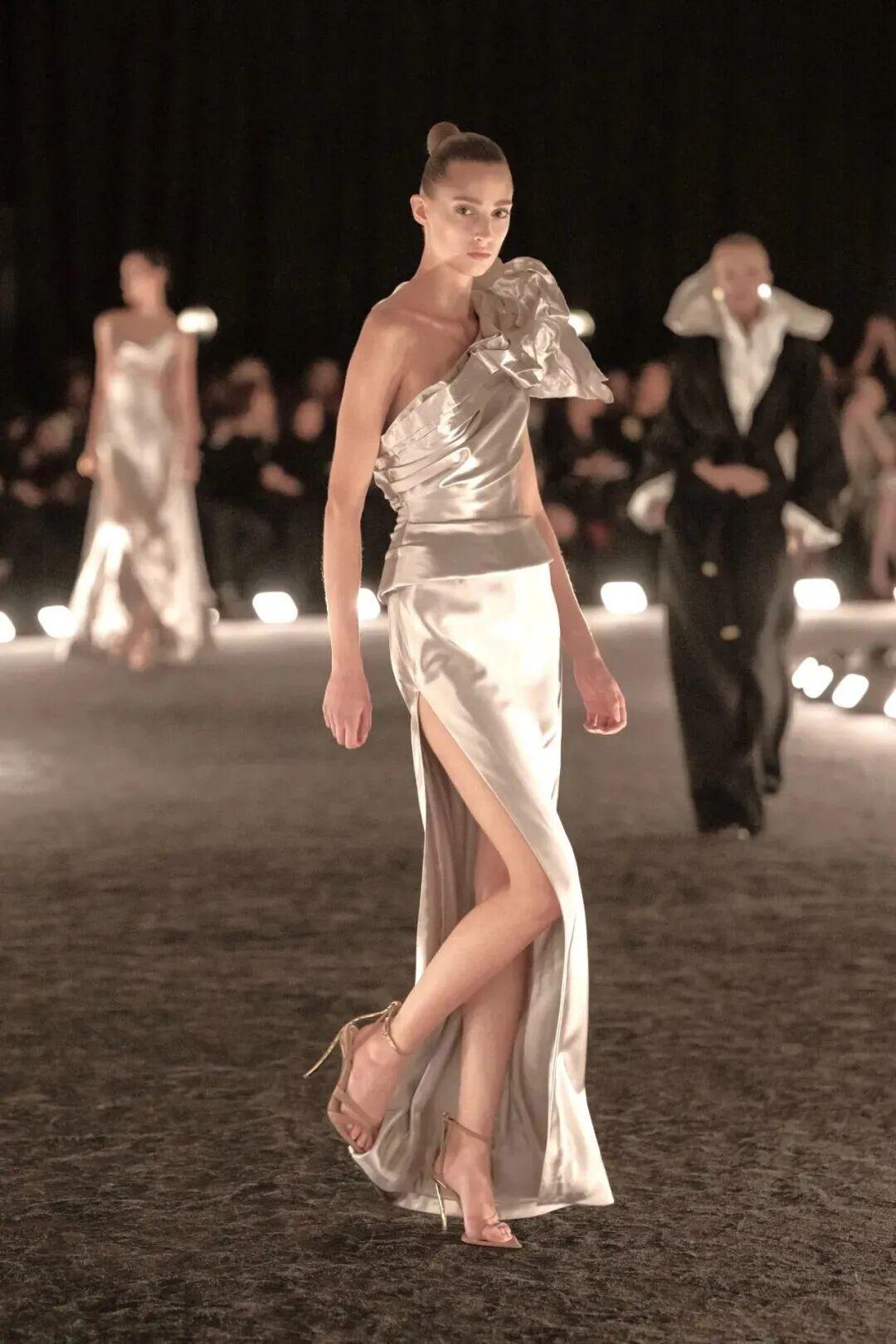 这是一次由目光点燃的对话——心之所向,彼此凝视,欲望在指尖轻轻游移。修长垂坠的轮廓勾勒出身体的流动曲线,开衩间肌肤的瞬间闪现,若隐若现的皮革胸衣,如欲望的呢喃低语。丝绸的柔滑、皮革的冷峻、羊绒的温润,在肌理交错间铺陈出感官盛宴。