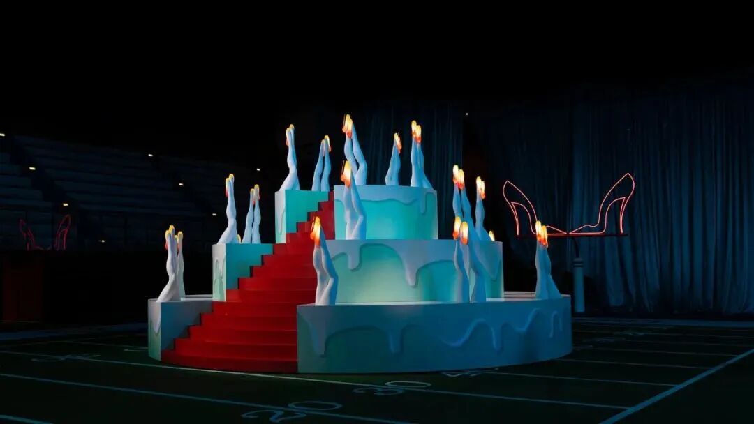 灵感源自美国小镇返校节的青春记忆,现场化身为充满张力的梦幻舞台。五幕演出层层递进:从巴黎消防员乐队的行进表演,到啦啦队与舞者的热血竞技,再到终章庆典的澎湃盛景,尽展节日的欢腾与胜利的喜悦。法国超模推着割草机悠然登场,拉开奇幻序幕;Louboutin 钟爱的海马吉祥物俏皮亮相,法式优雅与美式活力在音乐与舞动中交织,诠释自由与浪漫的交融。