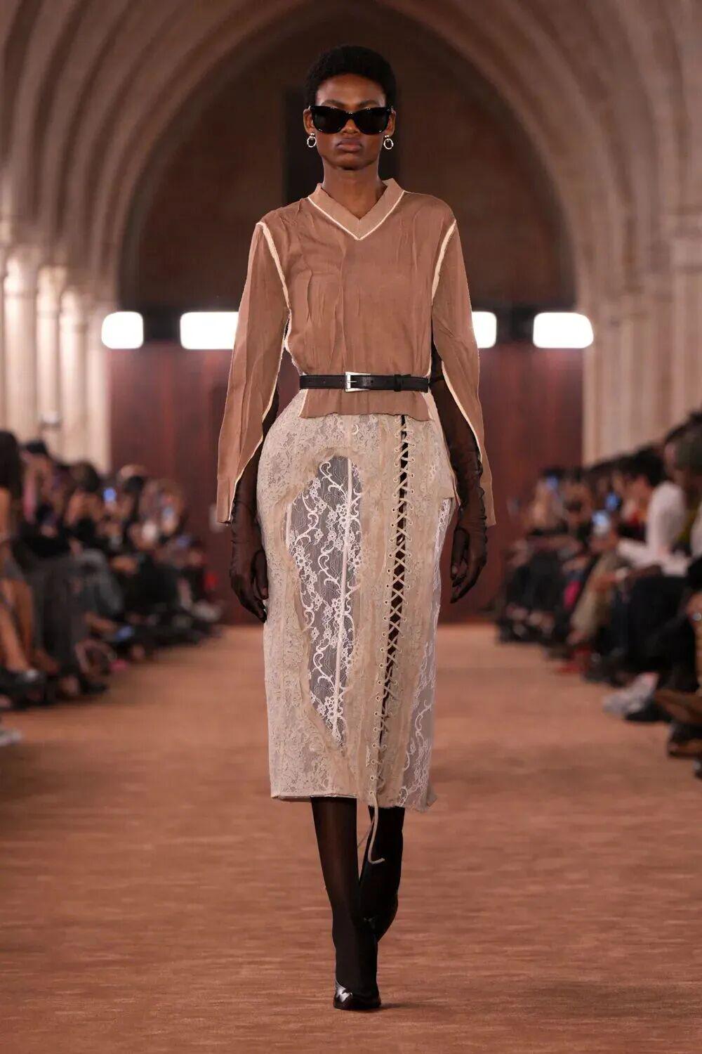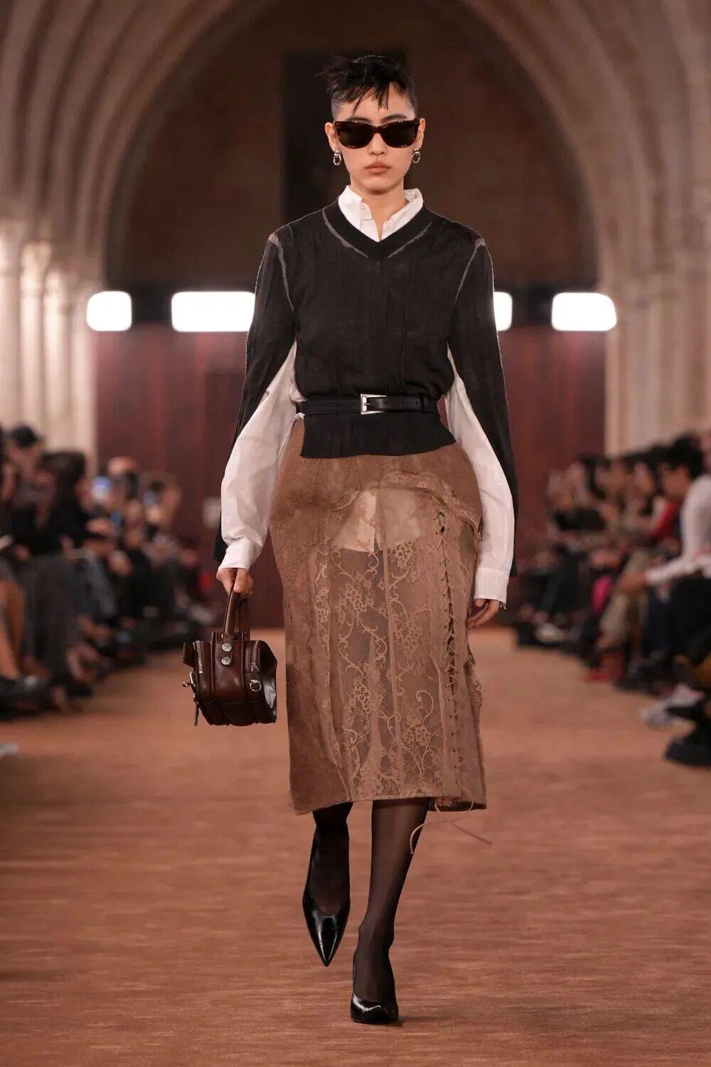 系列以中性张力塑造自信轮廓:错位西装与制服衬衫勾勒从容气度,定制蕾丝化为第二层肌肤般的雕塑感装束,展现工艺之美。透明感与对比手法贯穿始终:法兰绒衬衫叠搭薄纱吊带裙,皮革与丹宁经打蜡与解构重组,呈现出独特的旧化质感。针织层叠、镂空毛衣、磨损牛仔,共同构筑出松弛与锋锐并存的视觉语言。