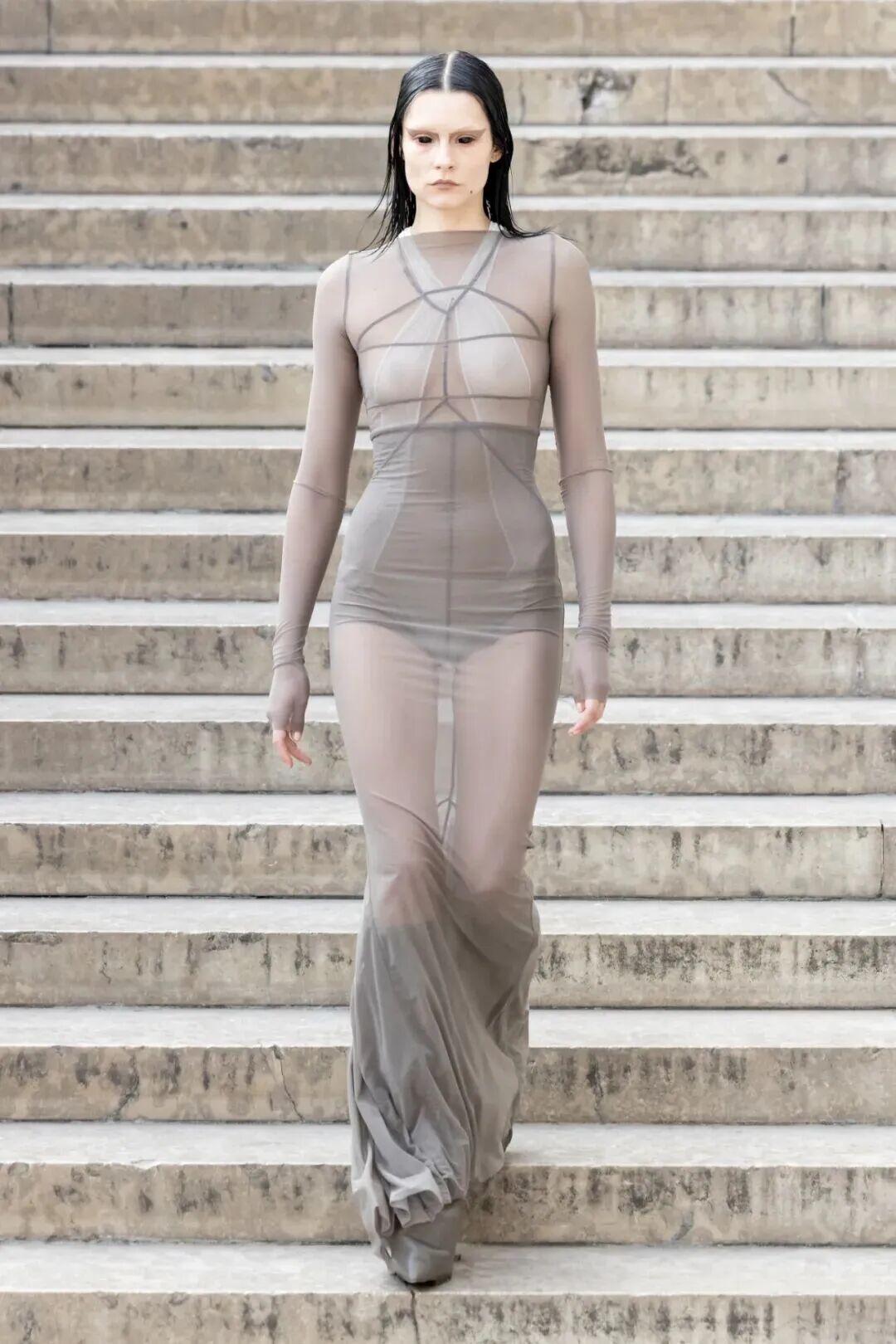 Rick Owens 2026 春夏女装系列以 “TEMPLE” 为名,与加列拉宫博物馆正在进行的回顾展“Temple of Love”相呼应。正如设计师所言,他始终试图用美国式的直白视角去诠释欧洲的美学积淀。本季依然延续这种文化交锋,将粗粝与华丽、克制与张扬并置,营造出一种带有宗教仪式感的戏剧氛围。