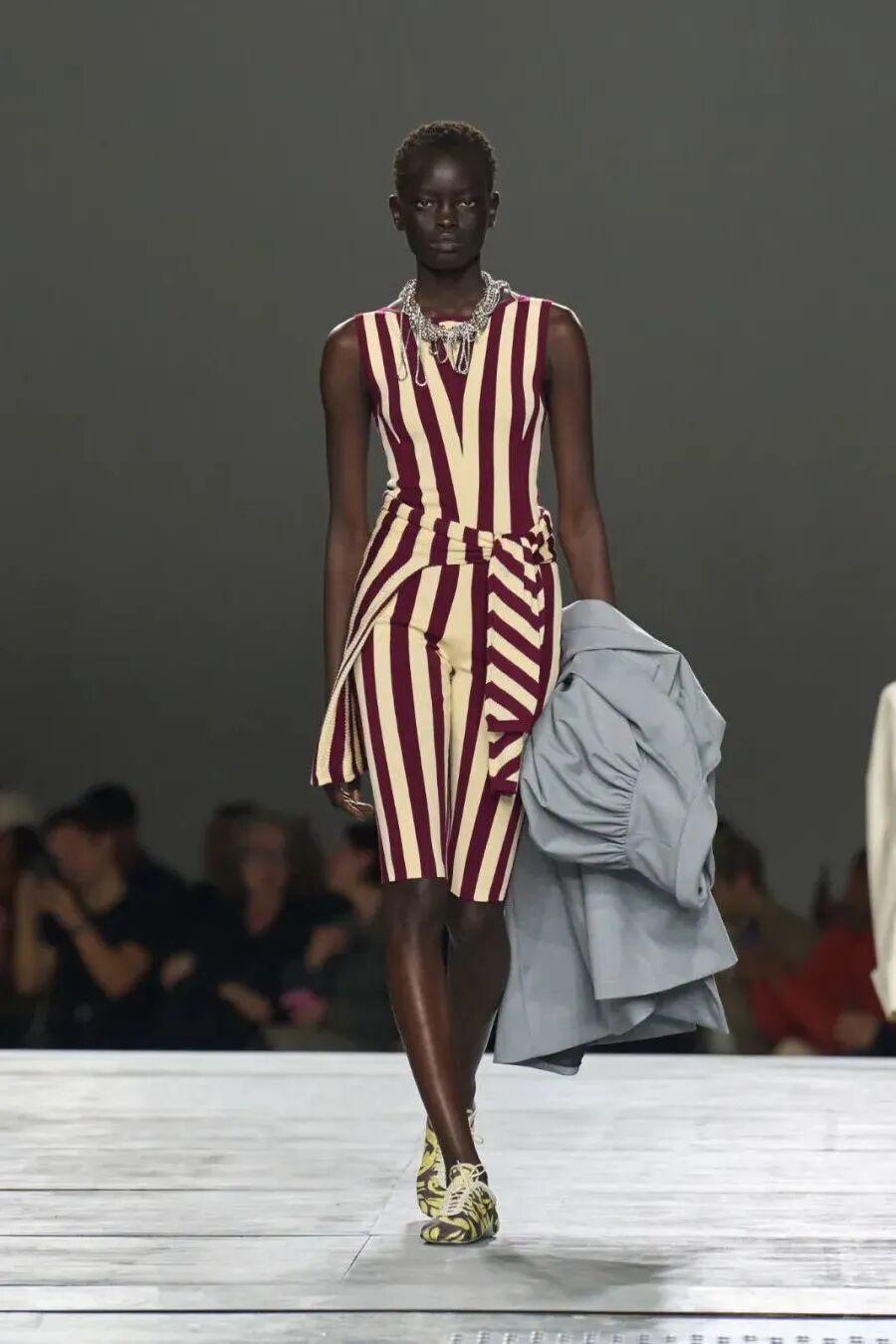 配饰与细节进一步强调“海滩的日常感”:珠宝宛若拾贝般自然簇拥,平底运动鞋与宽松条纹针织传递轻松氛围,柔软大容量包袋呼应自在旅程。Dries Van Noten 再次以诗意的方式将自然能量与城市节奏交织,勾勒出属于夏日的自由乐章。
