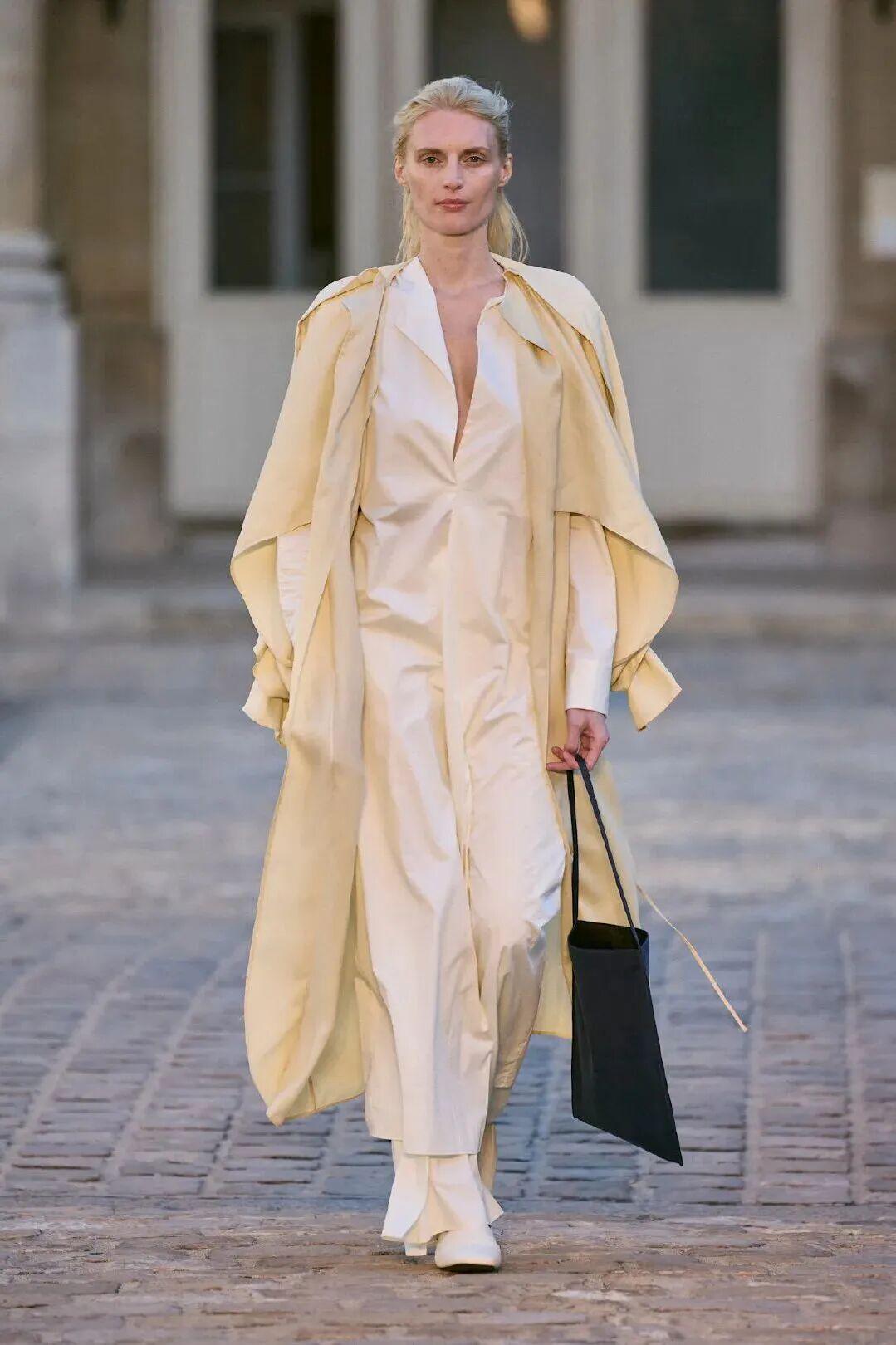 此次发布会选址品牌位于巴黎的总部,延续Trotter时期为Carven塑造的简约优雅基调。Thomas以更为克制的视角重新诠释Carven的现代语汇:清晰线条构筑出流畅轮廓,形与意浑然一体,展露低调而坚定的优雅。 色彩上以沉静为底,映衬肌肤的光泽与质感——从Carven夫人挚爱的兰花白,到烟黑与灰调的克制对比,再到浅米色的温柔平衡,构成静谧而富有张力的视觉秩序。蕾丝、内衣廓形、棉质纱、提花、真丝与波纹绸交织成章,延续法式工艺的柔美底蕴与永恒魅力。