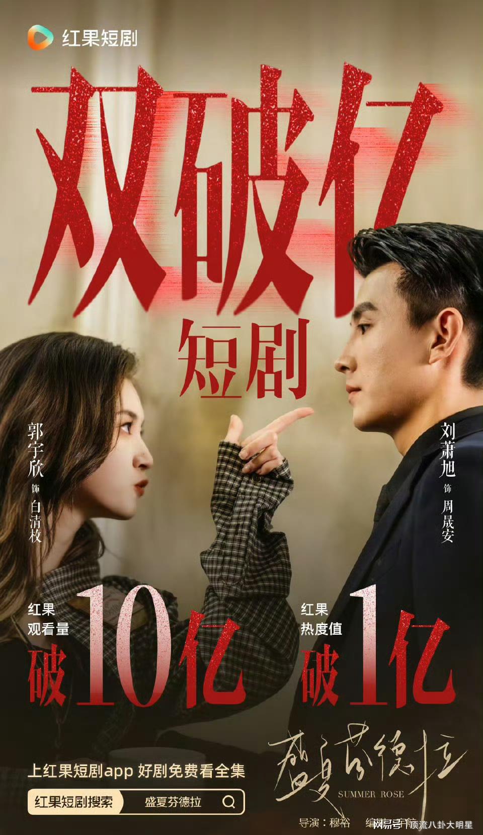 上线四天:累计播放量突破10亿,横扫平台所有榜单TOP1。主演刘萧旭抖音粉丝破百万,登顶红果演员榜TOP1;郭宇欣跃居女演员榜第六。
