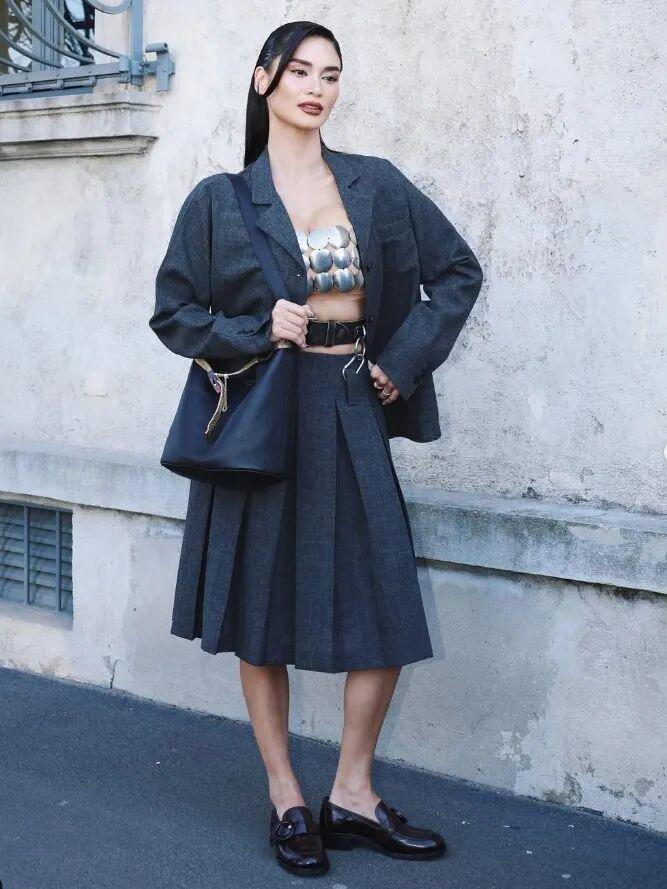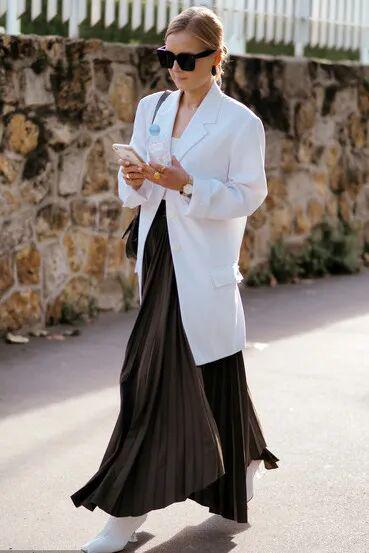 硬朗线条的百褶裙,与西装的搭配,堪称是一组门当户对的CP,适合小个子,也能轻松穿出减龄的时髦感。
