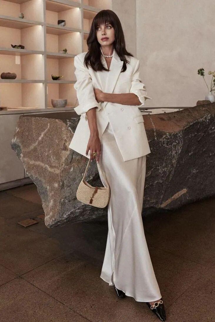 想要将这个组合穿得高贵而优雅,切忌太复杂的色彩,往往白色、米白色的西装外套,搭配各种不同色彩的缎面裙,视觉会更为协调有美感。