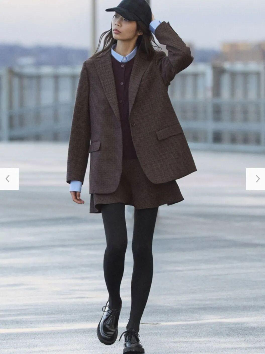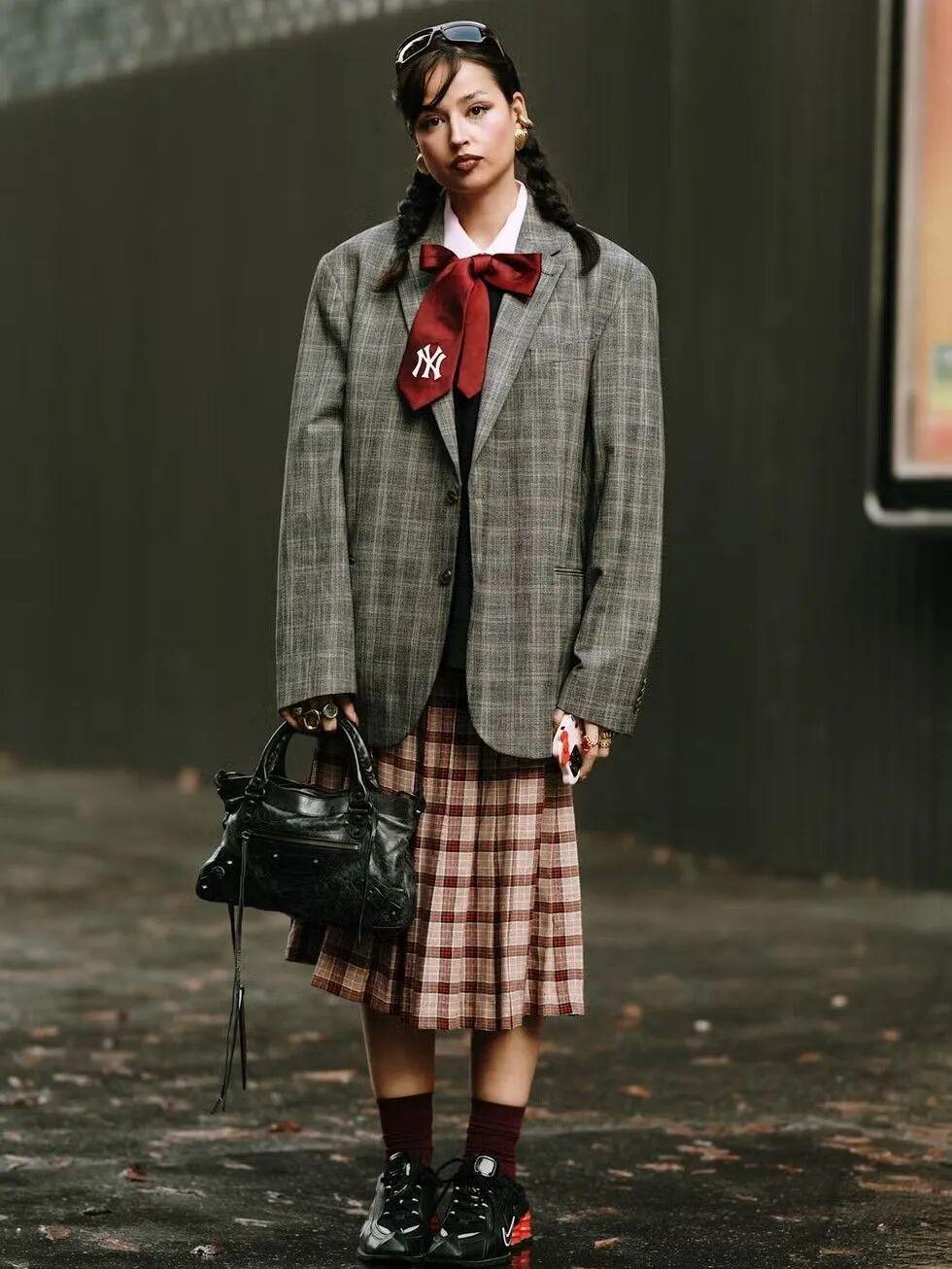 穿西装外套,我更推荐搭配深绿、深蓝、摩卡慕斯棕、红棕色调的格纹半裙,出彩百搭,打破萧瑟单调,还十分复古有腔调。