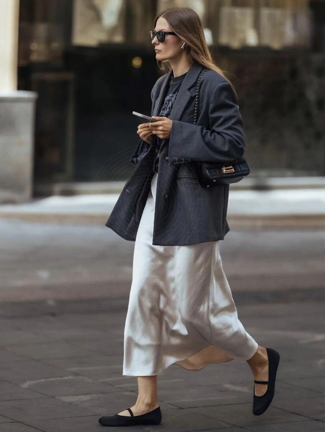 像今年比较火的缎面拼蕾丝元素的裙子,搭配西装外套,就在各种街拍中成为焦点。