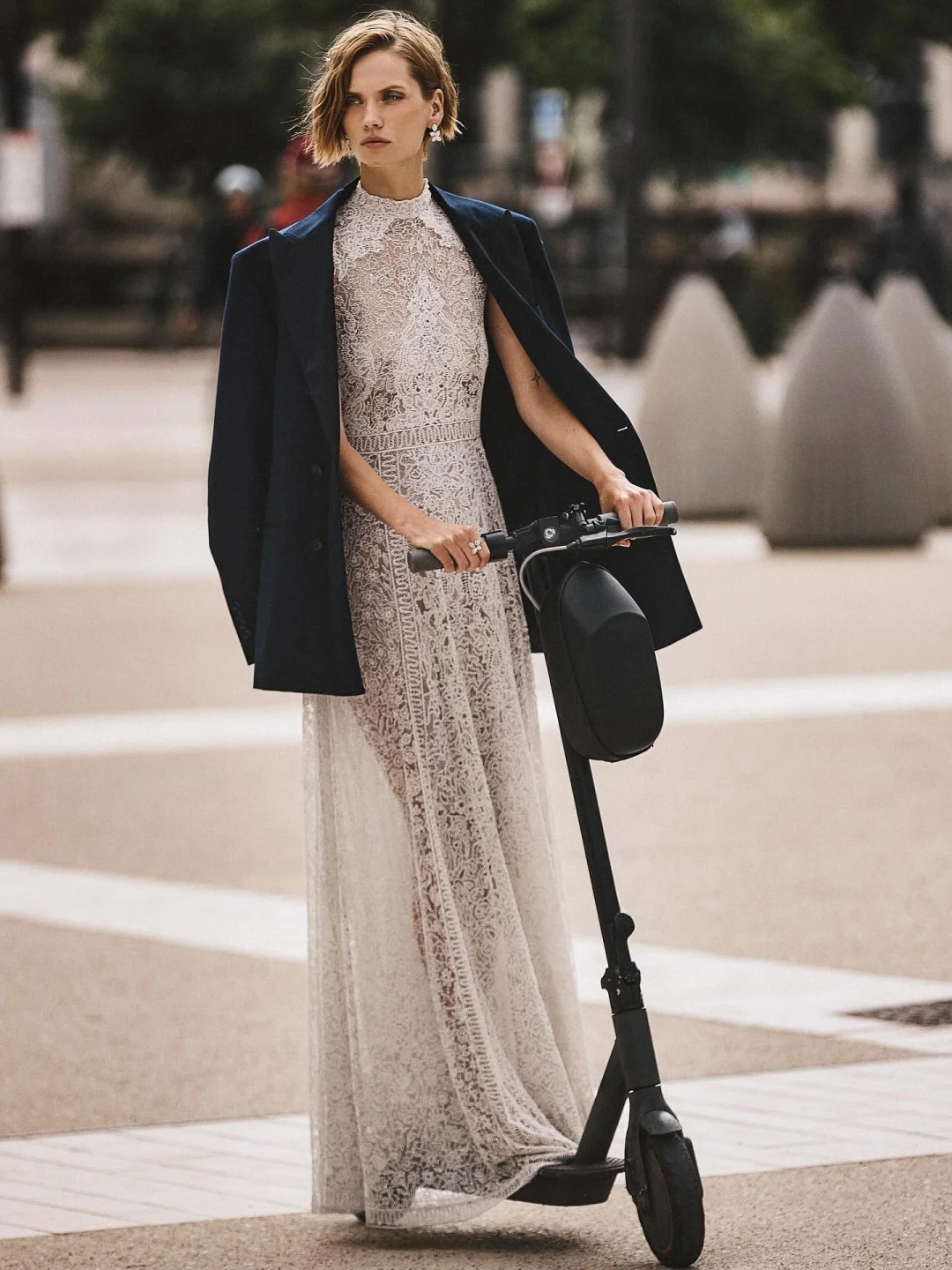 舒淇今年的一组look正是如此,黑色西装外套+长款的缎面蕾丝吊带裙+运动鞋,仿佛同时拥有力量与温柔,克制与浪漫......