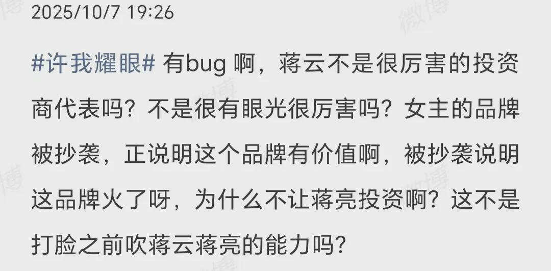 蒋云不是很厉害的投资商代表吗?不是很有眼光很厉害吗?女主的品牌被抄袭,正说明这个品牌有价值啊,被抄袭说明这品牌火了呀,为什么不让蒋亮投资啊?这不是打脸之前吹蒋云蒋亮的能力吗?