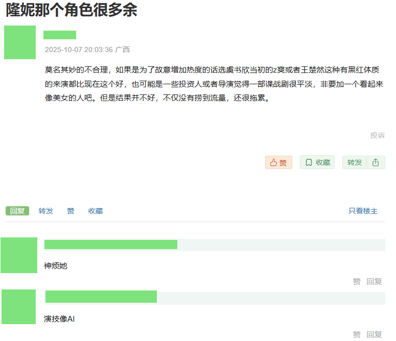 不止角色不讨喜、演员外形不符合设定,隆妮的演技也被不少观众吐槽:“神烦她”、“演技像AI”。