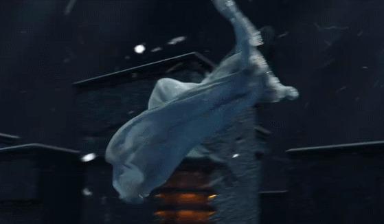 一个站在武器上展示帅气的瞬间,都能看到她前后摇摆的身体、翘着的胳膊、手指,一点英气都没有。