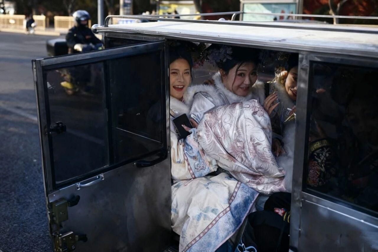 2025年2月19日,北京。一群身穿古代服饰的女子在故宫外乘坐电动三轮车。(图/CFP)