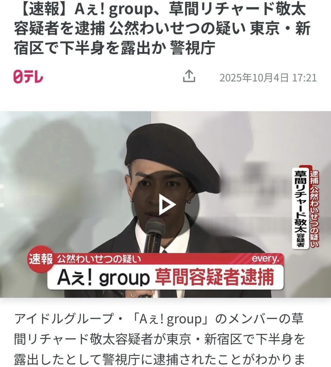 据日媒,4日凌晨,偶像团体“Aぇ! group”的成员草间Richard敬太在东京新宿区当街暴露下体,警方以公然猥亵嫌疑将其逮捕。6日,他获释现身,含泪向媒体鞠躬道歉后乘车离开。公司宣布将暂停其演艺活动。此外,《文春》还爆料草间一喝酒就爱放飞自我脱衣服、拍摄时经常迟到,有次整整迟到了三个小时。