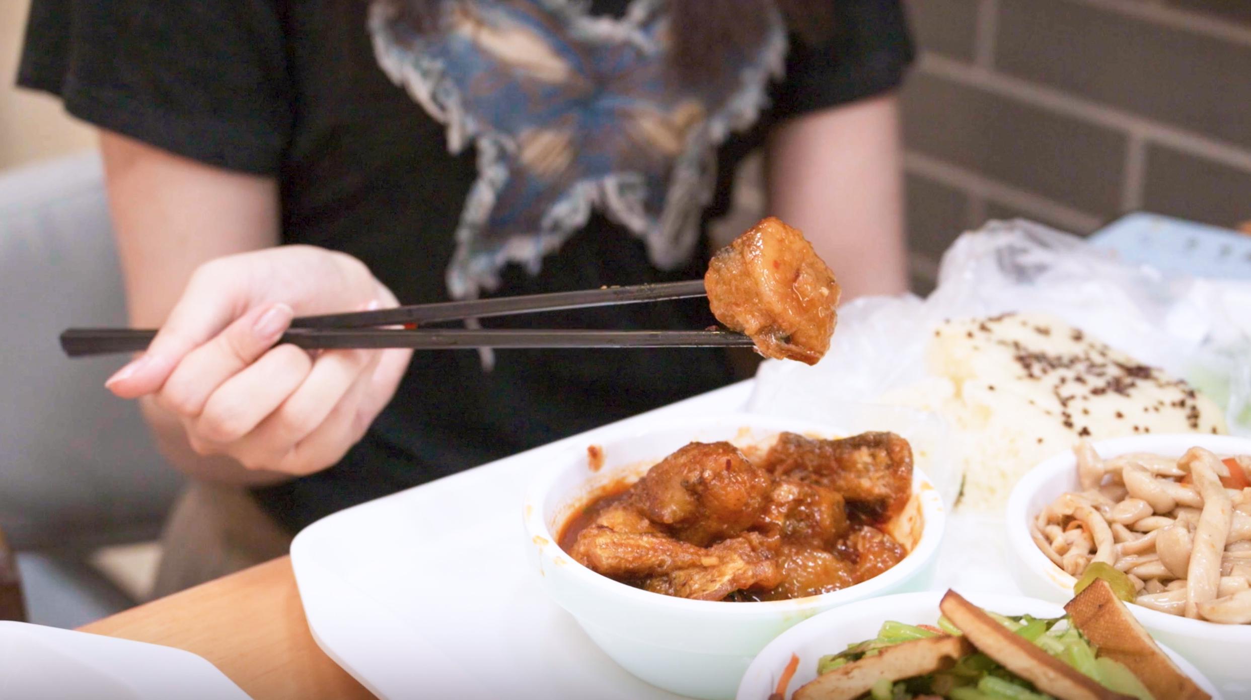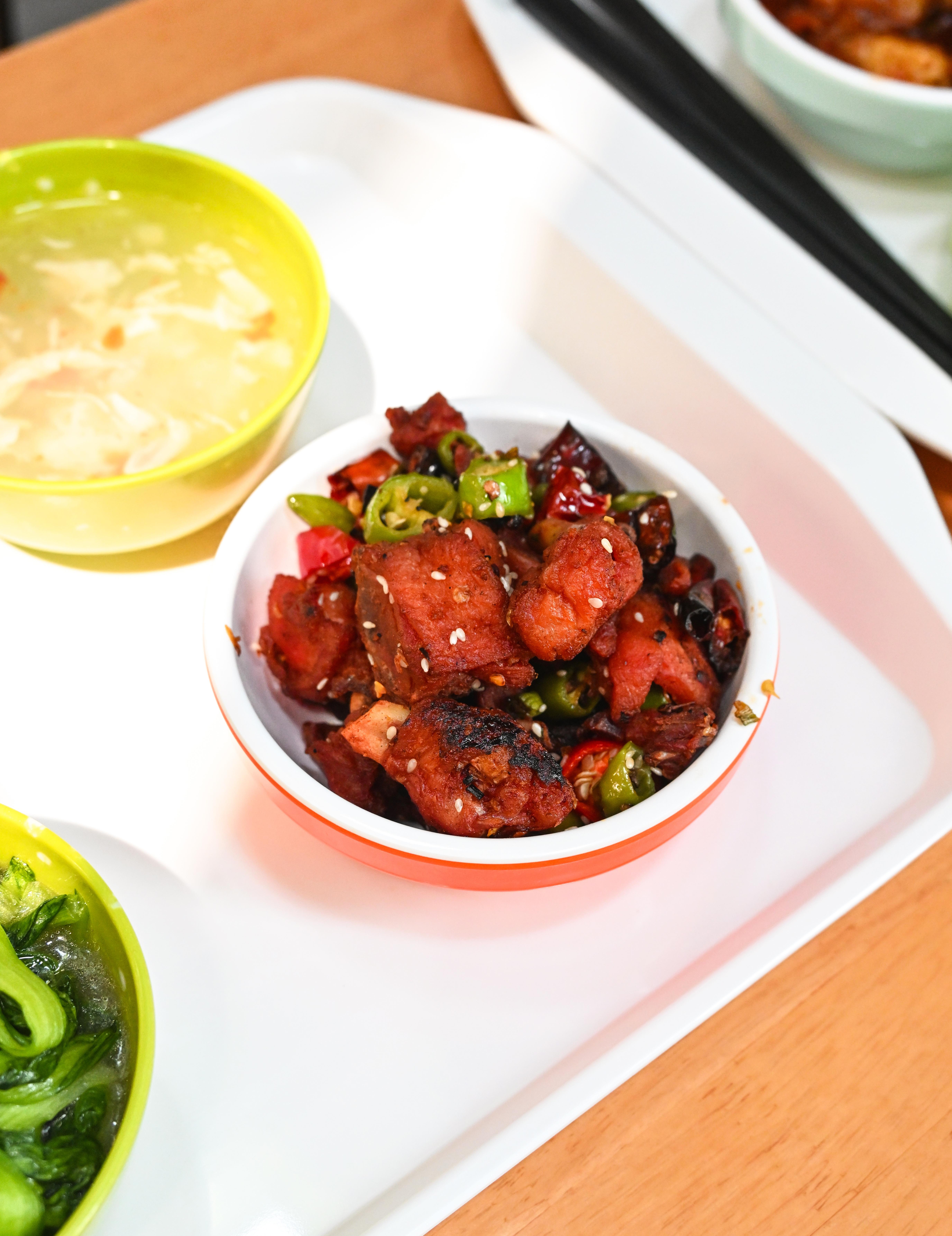 小江拿了辣子鸡和青菜各一份,小碗里盛得满满当当,份量很足。辣子鸡一份18元,选用的鸡肉肉足少骨,用青椒、干辣椒一道爆炒,再配上白芝麻,喜提小江“比公司食堂好吃很多”的评价。或许是考虑了老年人的口味,它的辣度较温和,不常吃辣的人也很好接受。